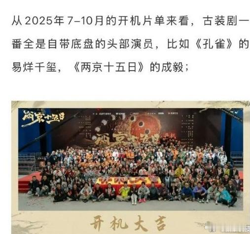 业内谈演员投资回报比,特别提到了易烊千玺新开机的《孔雀》和成毅新开机的《两京十五日》,都是一番自带底盘的头部演员,有流量,扛招商。