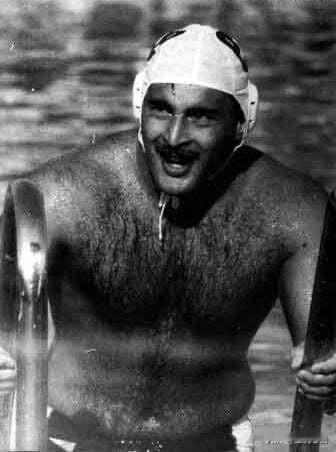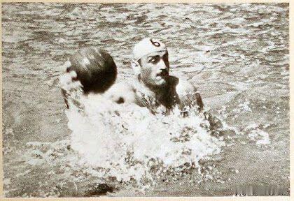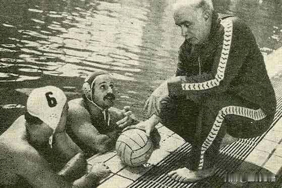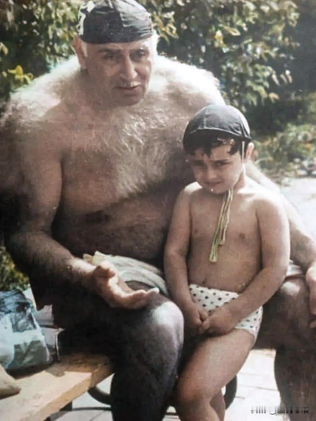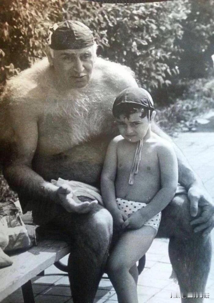 一张超有爱老照片!1990年苏联,传奇水球手彼得·姆什韦尼拉泽带着孙子游泳~