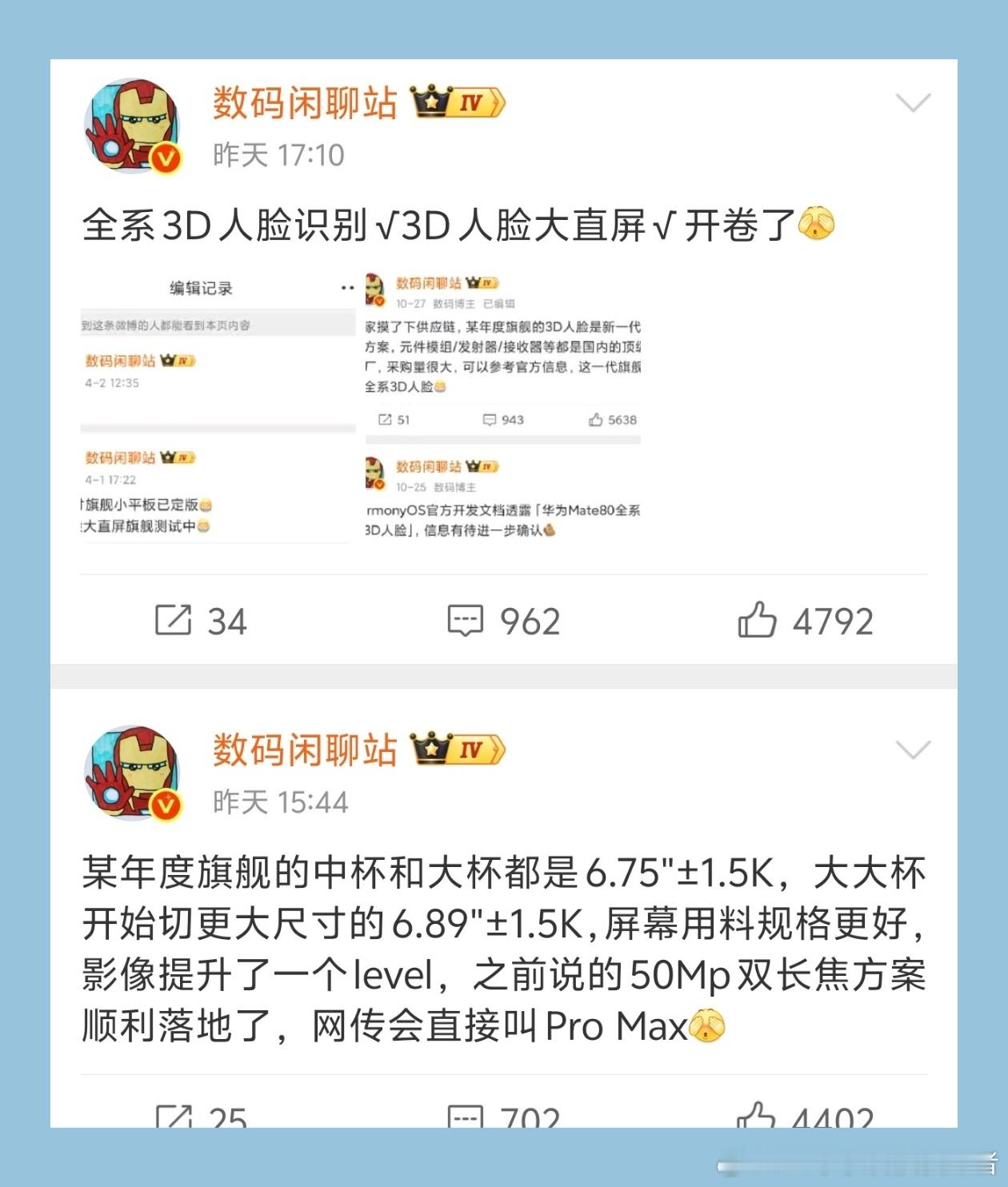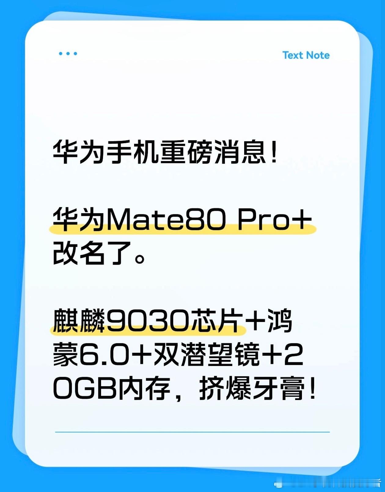 华为Mate80系列基本确认了,配置升级很大,产品定位有变动。根据目前的爆料,华为Mate80系列全系标配3D人脸识别。没错,标准版这次也给了3D结构光,直屏设计。全系都是海思麒麟9030芯片,但标准版和超大杯型号也会有一些差距,这个是肯定的。然后,华为Mate80 Pro+将更名为华为Mate80 Pro Max。华为Mate80 Pro Max和华为Mate80 Rs,将会搭载双潜望镜头,而且超级大杯版本还有一台20GB超大内存规格的配置。可以说,这次用料极为奢华。参考目前的产品路线,华为Mate80对标iPhone17;华为Mate80 Pro对标iPhone17 Pro;华为Mate80 Pro Max对标iPhone17 Pro Max;华为Mate Rs对标iPhone17 Pro Max的2TB版本,价格大家也可以预测了。