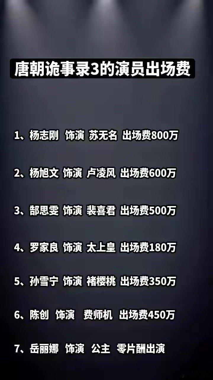 《唐朝诡事录3》的演员片酬最近被扒出来了,杨志刚演苏无名拿800万,杨旭文的卢凌风600万,其他主演也都是几百万的价。但岳丽娜演公主却一分钱没要,这事儿不奇怪。她跟导演郭靖宇是夫妻,合作多年,友情客串很正常。而且公主戏份不多,不是主线角色,圈里客串本来就常有低酬甚至免费的情况。就像咱们平时朋友帮忙搬个家,或者去熟人店里搭把手,哪好意思要钱?这既顾了情面,又给剧组省了成本,双赢的事儿。所以这零片酬不是啥大新闻,就是行业里常见的特殊情况罢了,没必要过度解读。