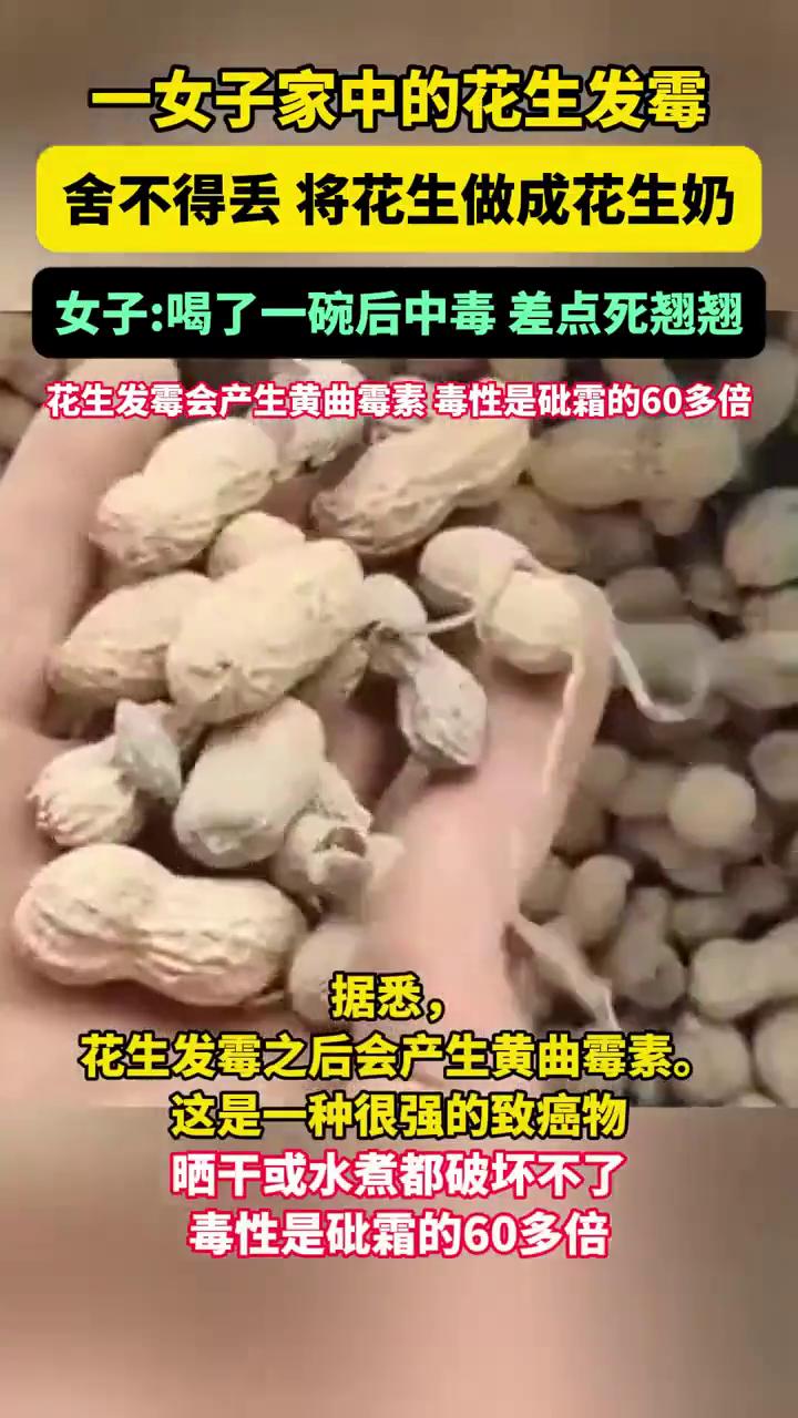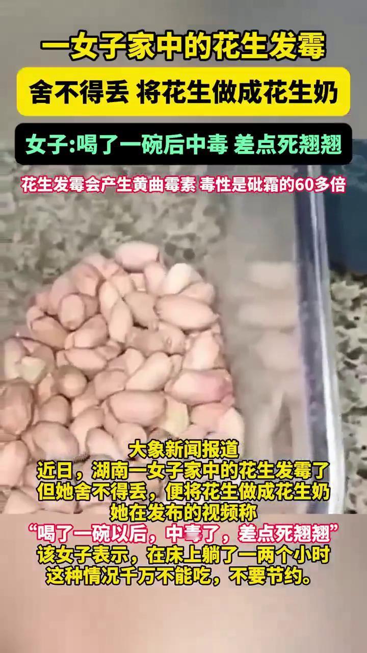 一女子家中的花生发霉,舍不得丢将花生做成花生奶。女子:喝了一碗后中毒差点死翘翘。 大象新闻报道。 近日,湖南一女子家中的花生发霉了,但她舍不得丢,便将花生做成花生奶。她在发布的视频称:"喝了一碗以后中毒了,差点死翘翘"。该女子表示,在床上躺了一两个小时,这种情况千万不能吃,不要节约。 据悉,花生发霉之后会产生黄曲霉素,这是一种很强的致癌物,晒干或水煮都破坏不了,毒性是砒霜的60多倍。霉变花生 花生吃法
