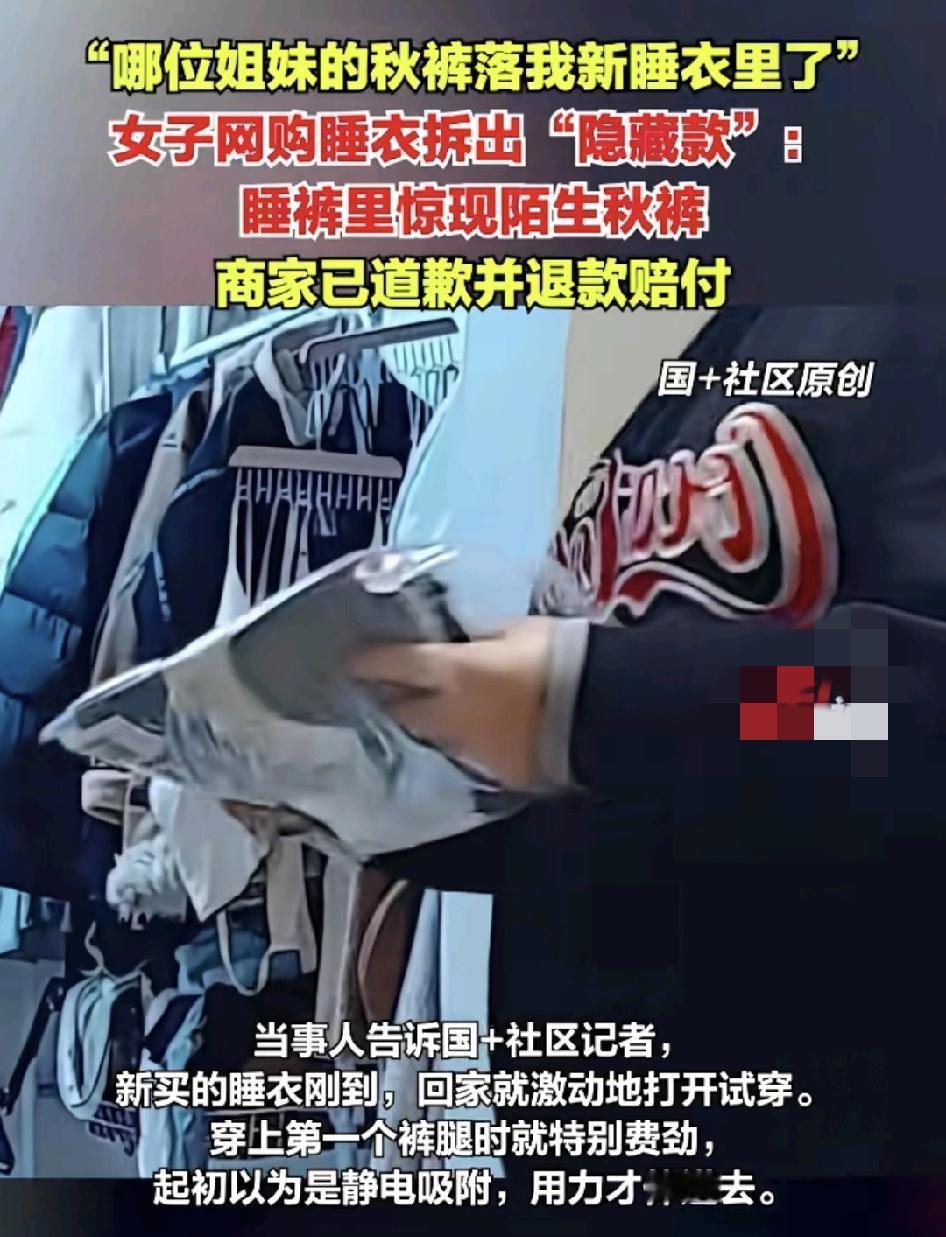 山东东营,一女子网上购买一套新睡衣,收到货试穿,刚穿上去有点费劲,以为这家衣服质量不错,用的是双层防磨料,但后来觉得不对劲,从裤裆里抽出一条秋裤,当时觉得很雷人,一定是上一位买家试穿忘记自己的秋裤脱下来了,女子第一时间联系买家,买家立即进行赔付,女子说看到卖家的态度还不错,自己也不计较了,但是建议买商家一定要加强监管的工作,收到退货一定要认真检查,如果有其他的物品就不好说了。