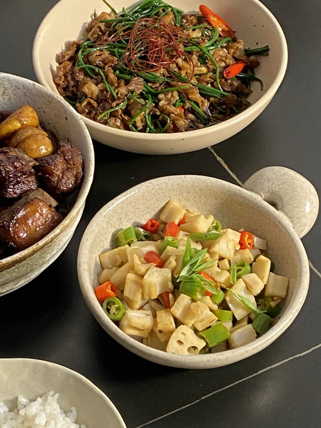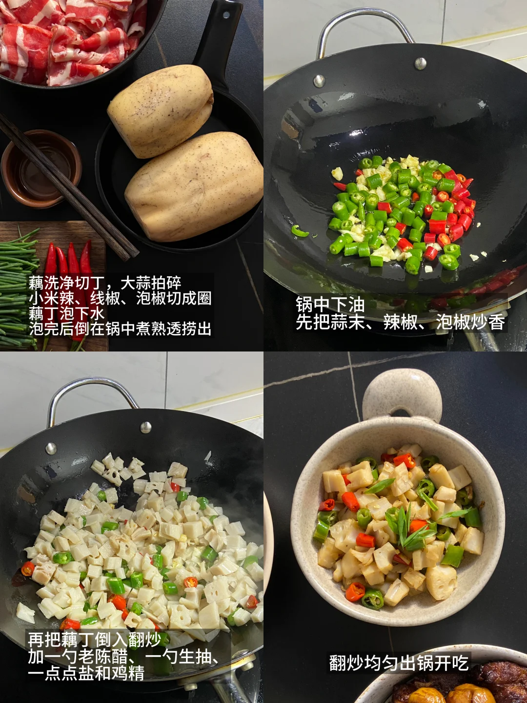 2)泡完水后倒在锅中煮熟透捞出,锅中下油,先把蒜末、辣椒、泡椒炒香,再把藕丁倒入翻炒,加一勺老陈醋、一勺生抽、一点点盐和鸡精,翻炒均匀开吃
