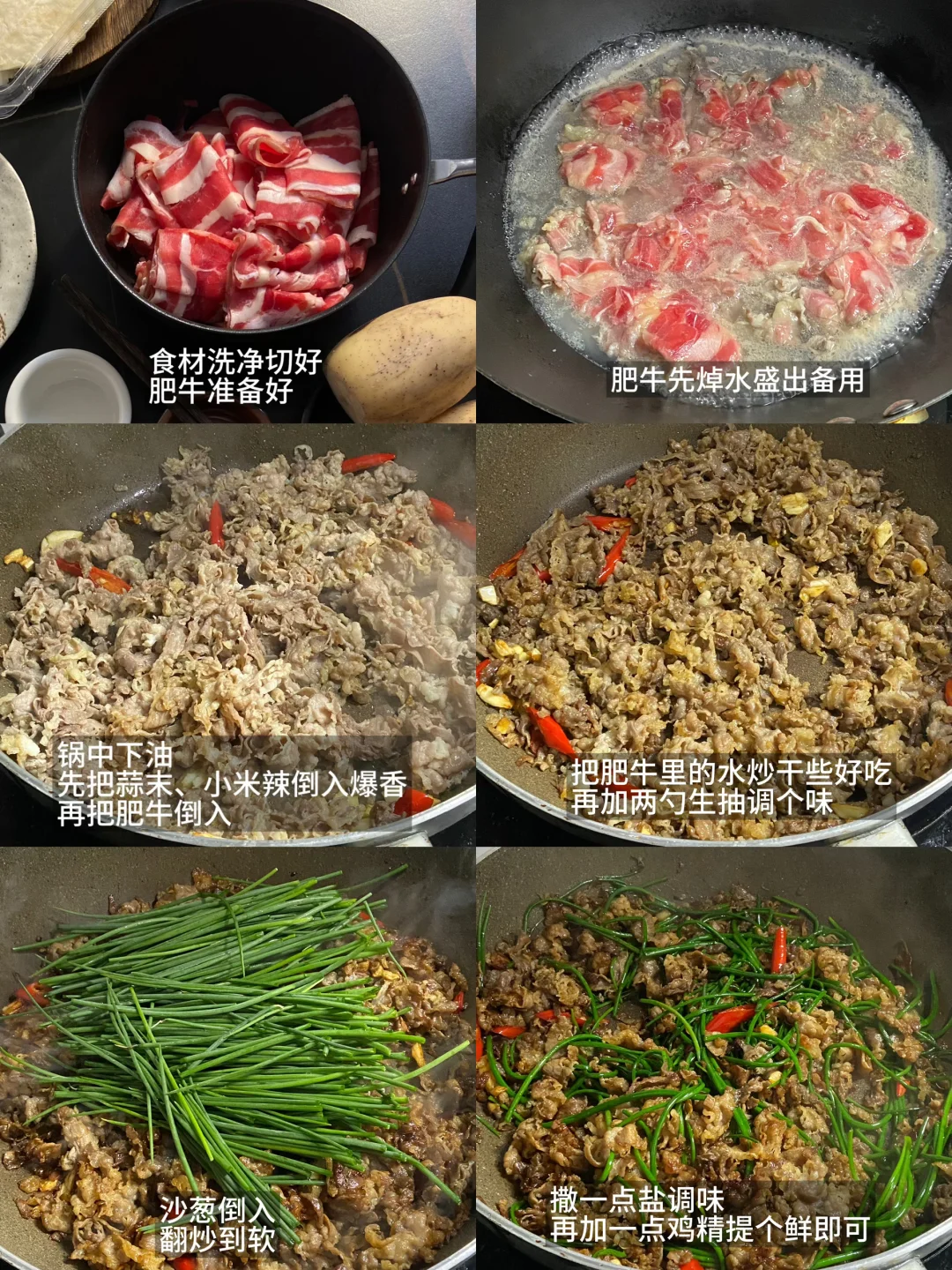 3)再把肥牛倒入,翻炒到稍微干一点的状态,加两勺生抽调味翻炒均匀,再把沙葱倒入炒到软