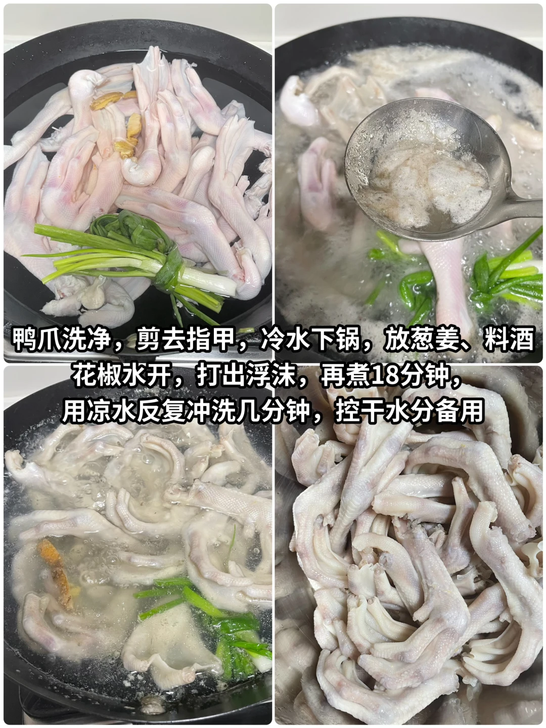 1⃣️鸭爪洗净剪去指甲,冷水下锅,放入葱姜,料酒,花椒。水开打出浮沫,再煮18分钟,用凉水反复冲洗几次,控干水分备用。