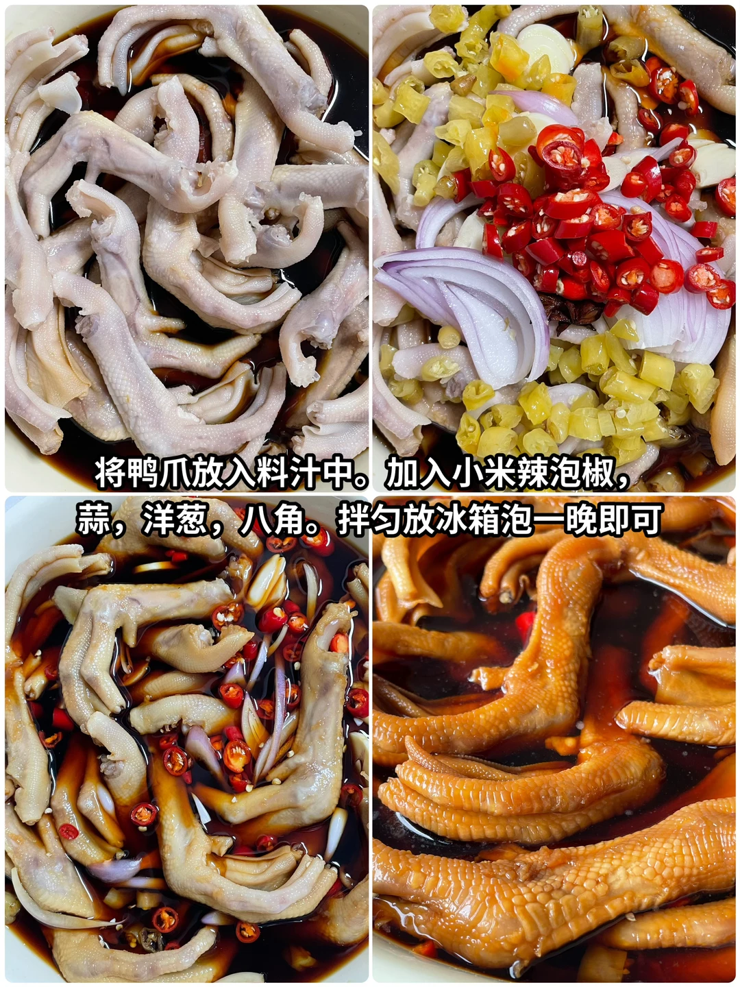 4⃣️ 将晾好的鸭爪放放入调好的料汁中,加入小米辣、姜蒜、洋葱、八角拌匀,放一放冰箱泡一晚即可。