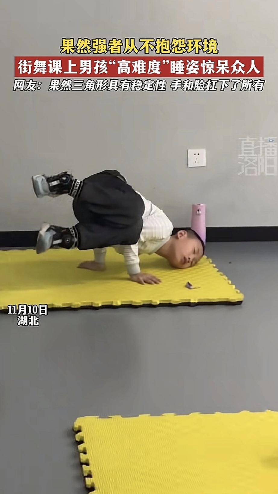 最近在湖北的一节街舞课上,发生了有趣的一幕。一个小男孩在课堂上困得不行,竟然直接趴在地上睡着了。 最逗的是,他的睡姿特别“高难度”——脸贴在垫子上,双手撑起身体,看着跟个三角形似的,睡得还挺稳。旁边的同学和老师都看呆了,有人拍下来发到网上。 网友们都被逗乐了,纷纷开玩笑说:“果然三角形最稳当!”还有人说:“脸和手这是替他扛下了所有啊!”看来这孩子是真困坏了,在哪都能睡得这么香。