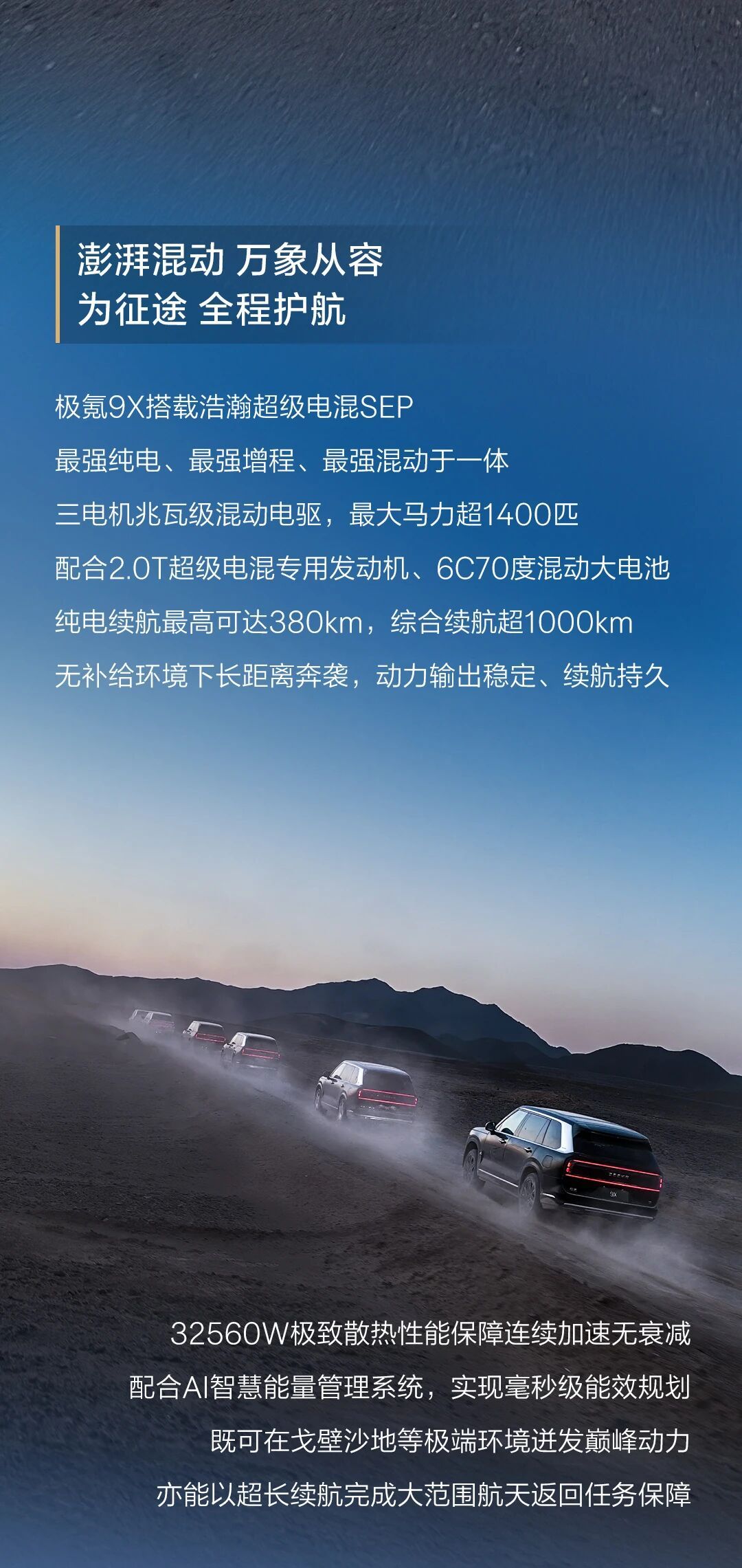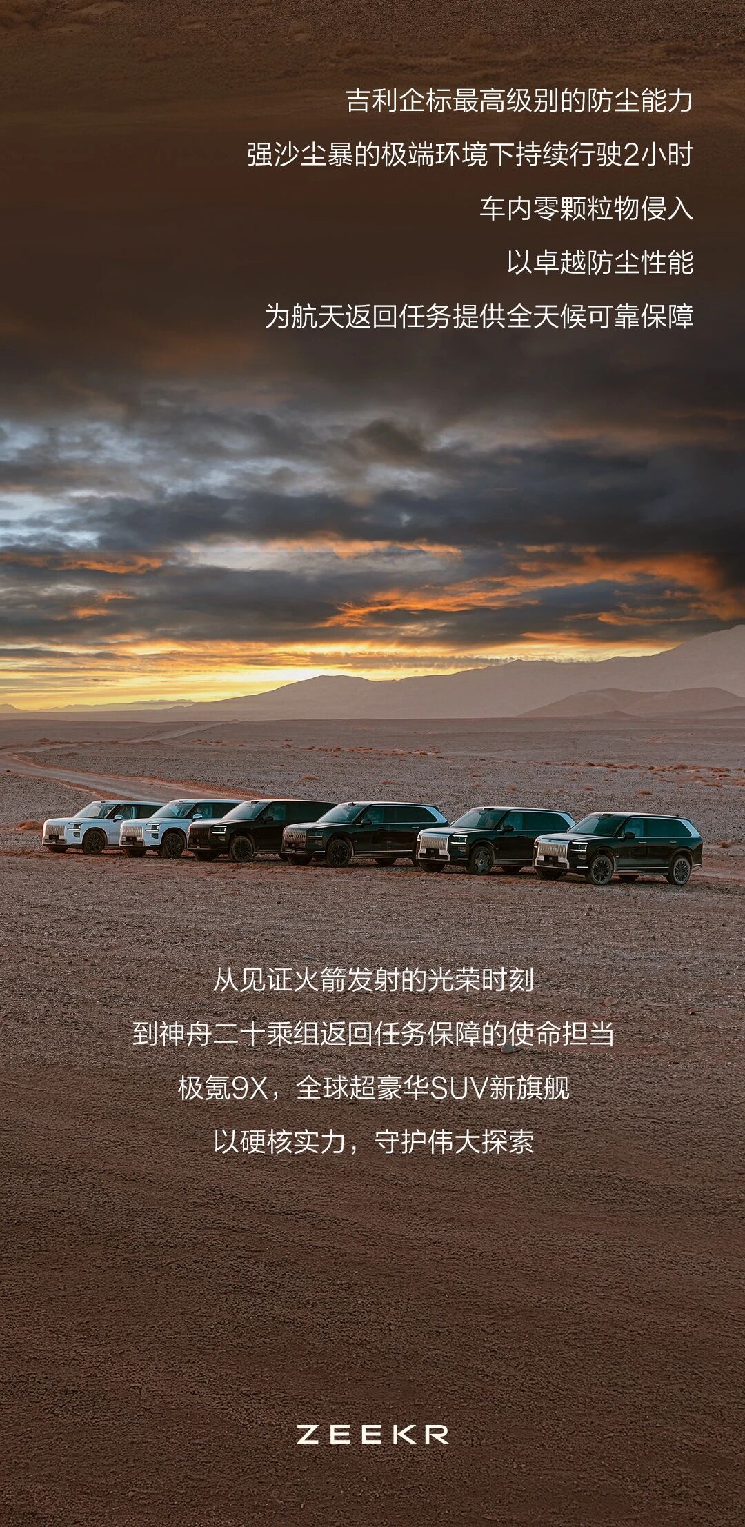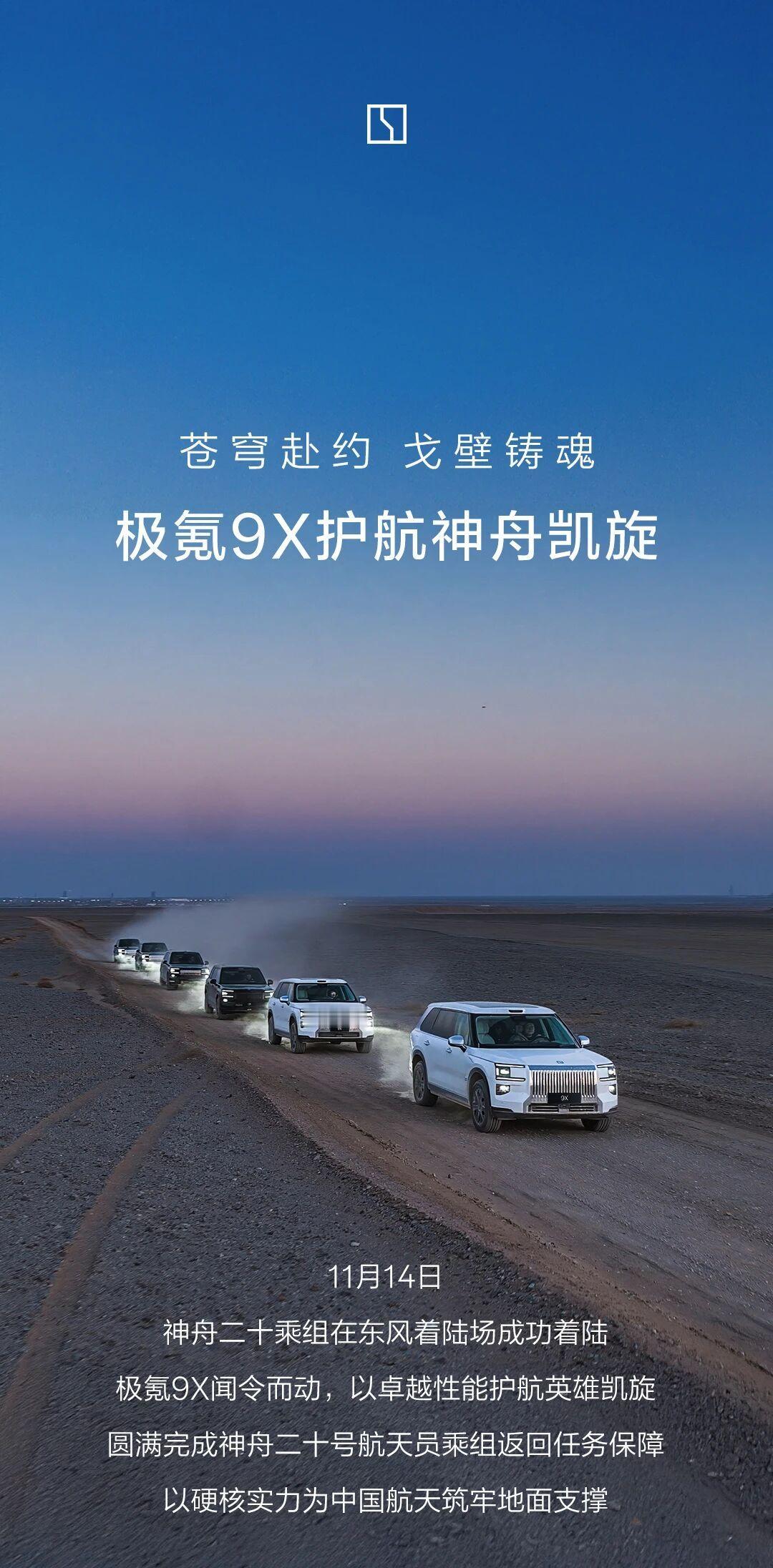 恭喜极氪9X圆满完成神舟二十号返回保障任务2025年11月14日,神舟二十号航天员乘组在东风着陆场平安归来,创下单乘组在轨204天的新纪录。中国新一代豪华旗舰极氪9X不负重托,作为首款参与航天返回任务的中国品牌豪华SUV,圆满完成保障使命,用硬核实力见证国之荣光。东风着陆场戈壁沟壑纵横,低温沙尘与高海拔环境严苛至极。极氪9X凭浩瀚超级电混SEP的1030kW澎湃动力,5000米海拔动力不衰减;第四代热管理架构与顶级防尘设计,从容应对极端气候;浩瀚AI数字底盘与千里浩瀚辅助驾驶系统,让高速奔袭与复杂路况切换自如。从进口车垄断到中国品牌领航,极氪9X以航天级可靠性,印证了中国高端智能制造的突破。中国汽车与中国航天两大国家战略产业跨界共振,共筑民族复兴新坐标,让自主科技的光芒闪耀戈壁与星空!
