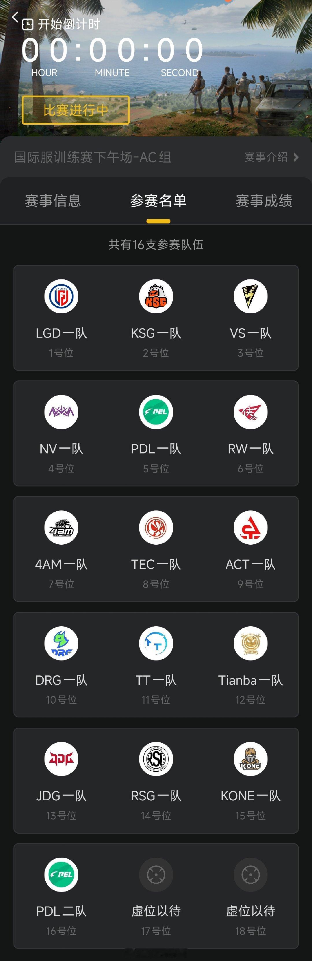 【11.15 国际服AC组 训练赛】今日参加战队:LGD、KSG、VS、NV、PDL一队、RW、4AM、TEC、ACT、DRG、TT、Tianba、JDG、RSG、KONE、PDL二队