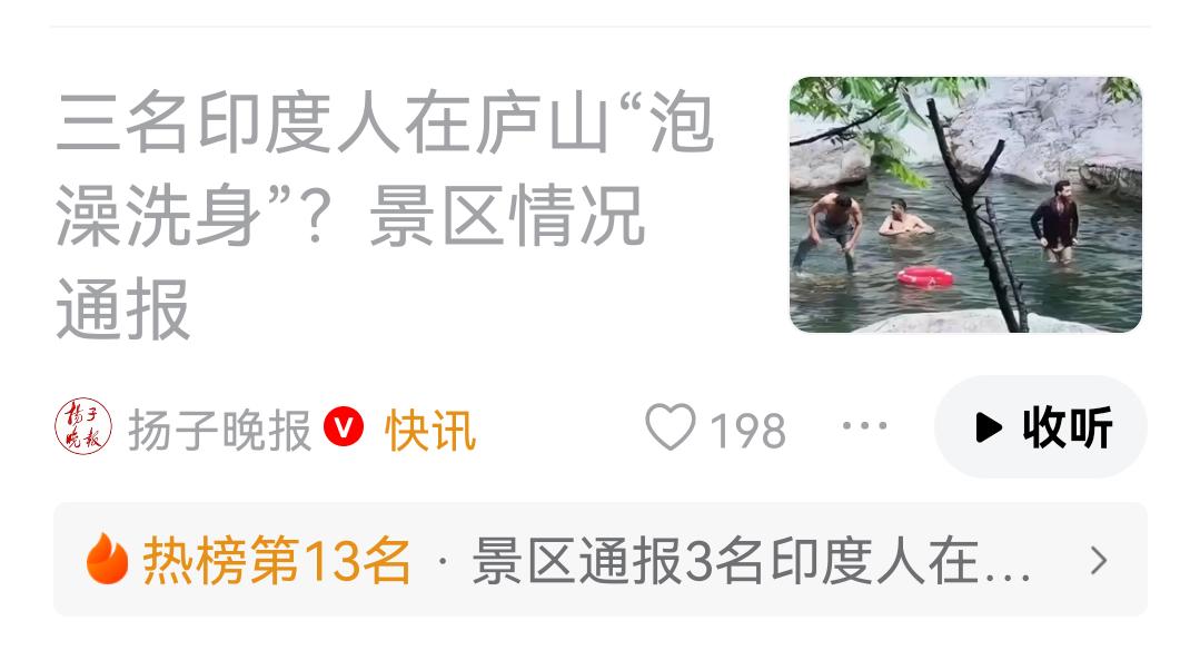 三名印度阿三在庐山景区脱衣洗澡,引发中国人民高度愤慨,纷纷留言指责! 中国,已经不是百年前的中国,世界上没有高我们一等的民族。不管哪个国家的人,不管是谁,来到咱们的地盘就得遵守咱们的规矩,决不能有特殊待遇。 要想国强,民需自强,不能见了洋人矮三分,奴颜媚骨直不起腰来!