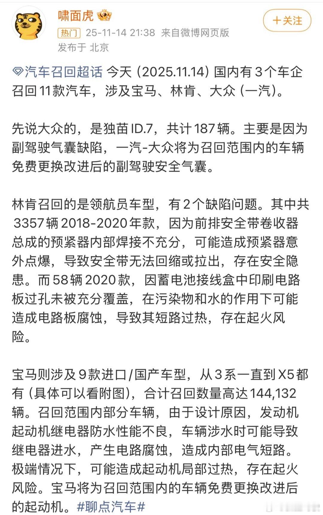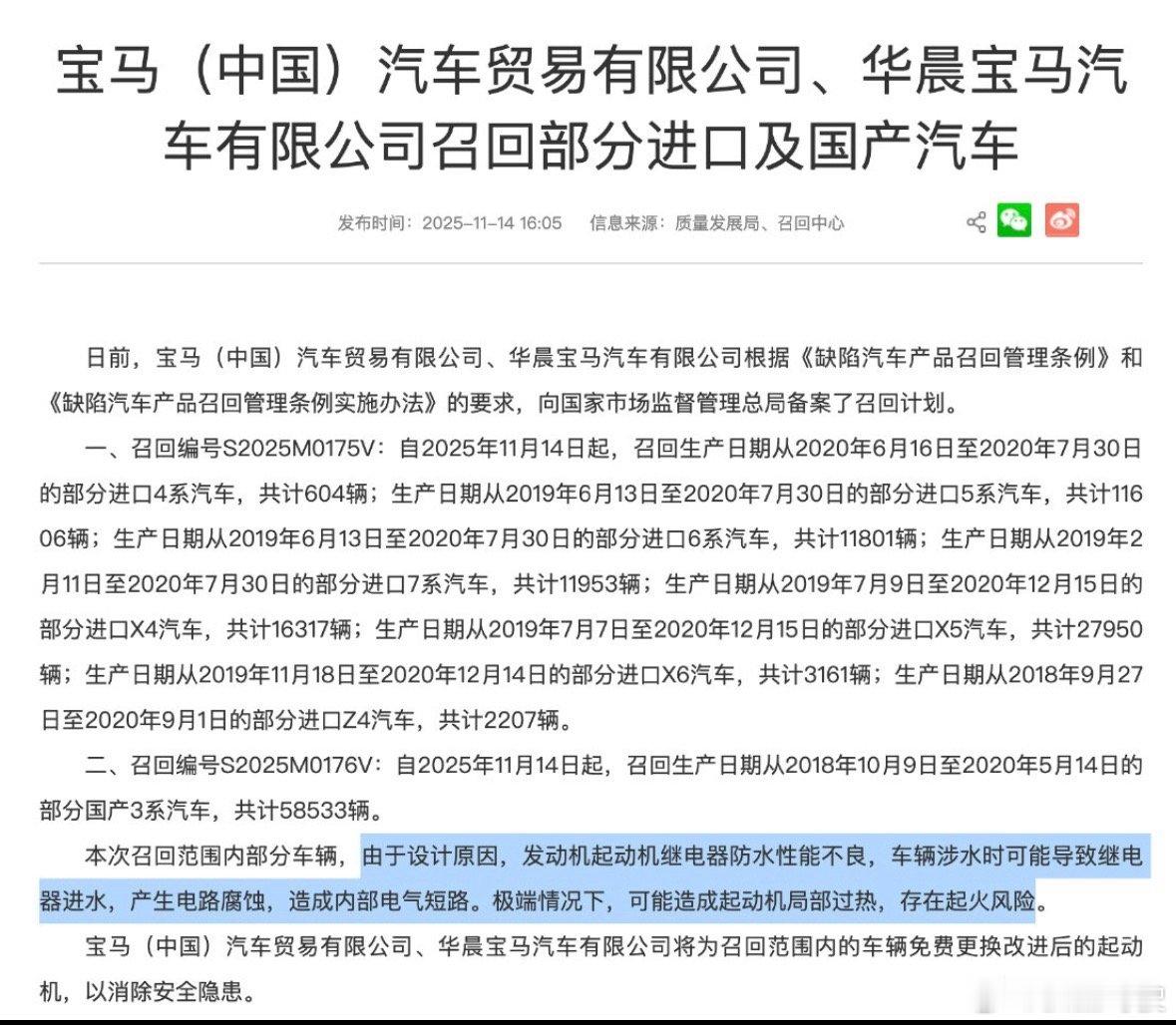 来说下吧召回并非单纯质量问题,而且对安全的态度。安全底线不缺位、行业趋势下的正常现象。燃油车(部分国产5系、X5及1辆进口5系新能源车(国产i3、iX3、i5、iX1及进口i4、i5等具体大家可以看下这个博主的内容,顺便看看有没有自己的车型