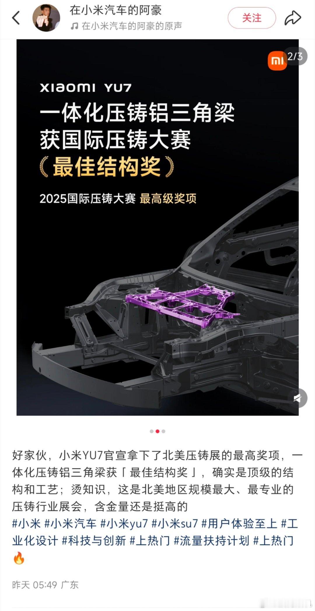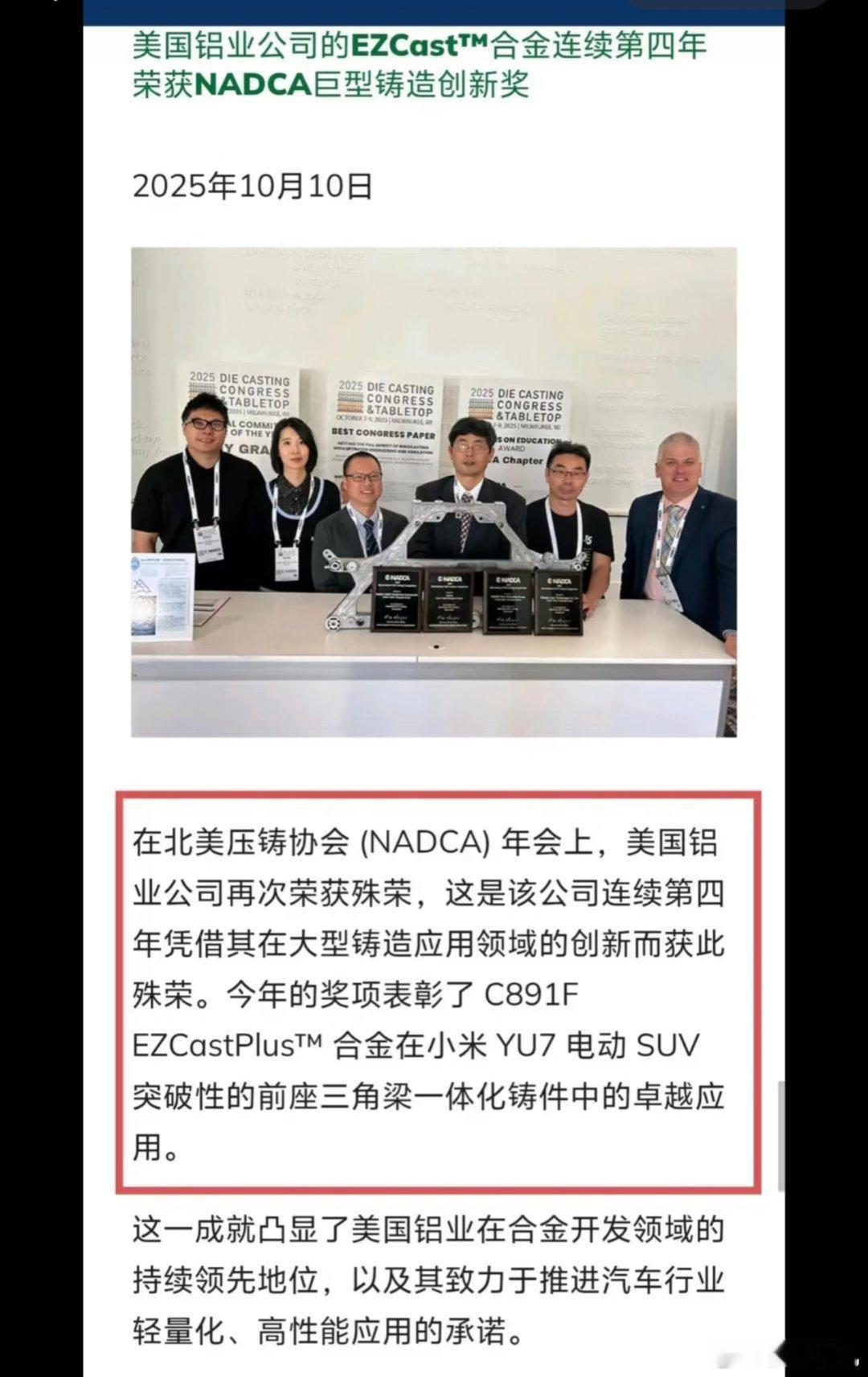 昨天小米汽车发博说自己拿下了北美压铸展的最高奖项,有人看到美国铝业也说自己获得这