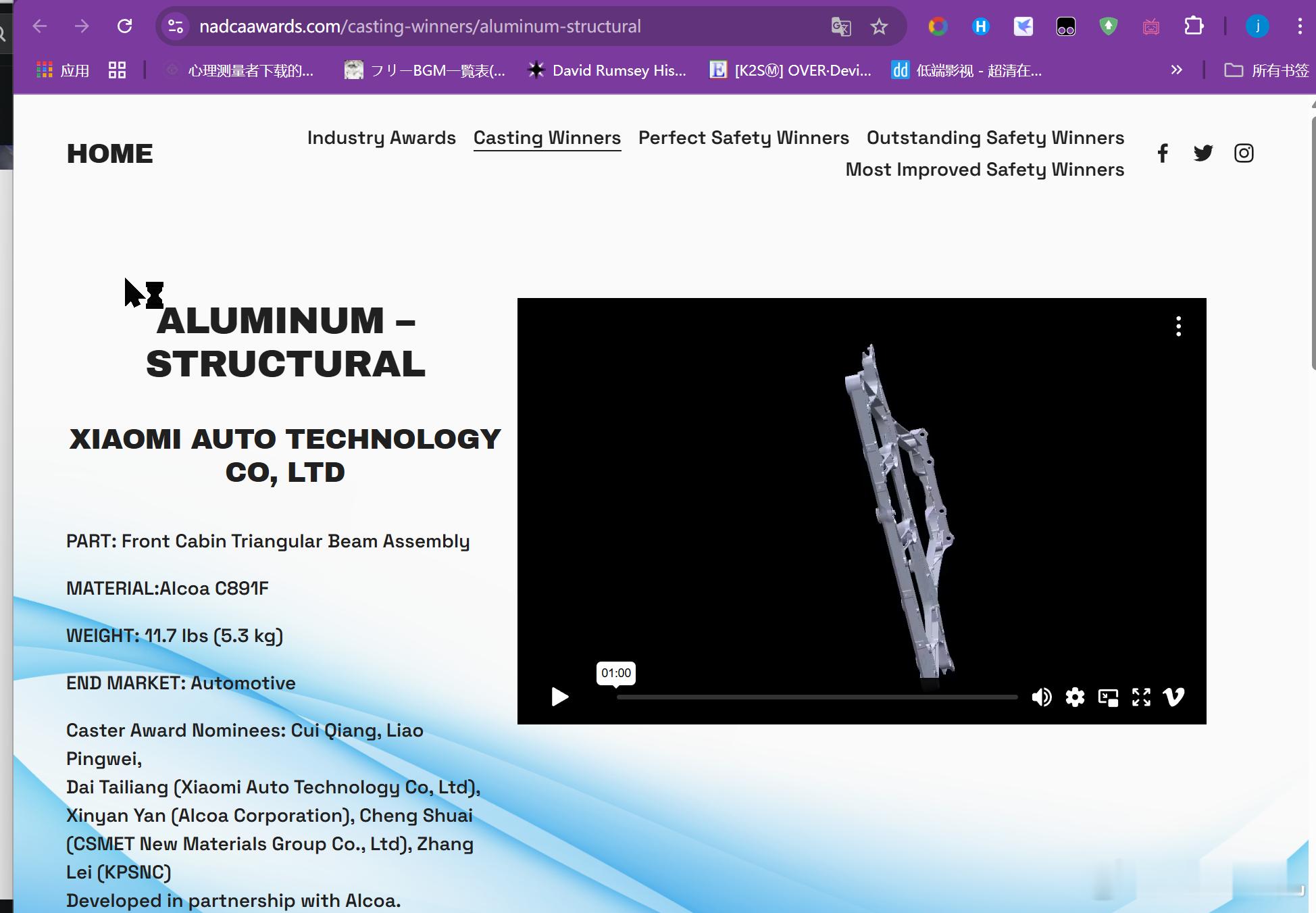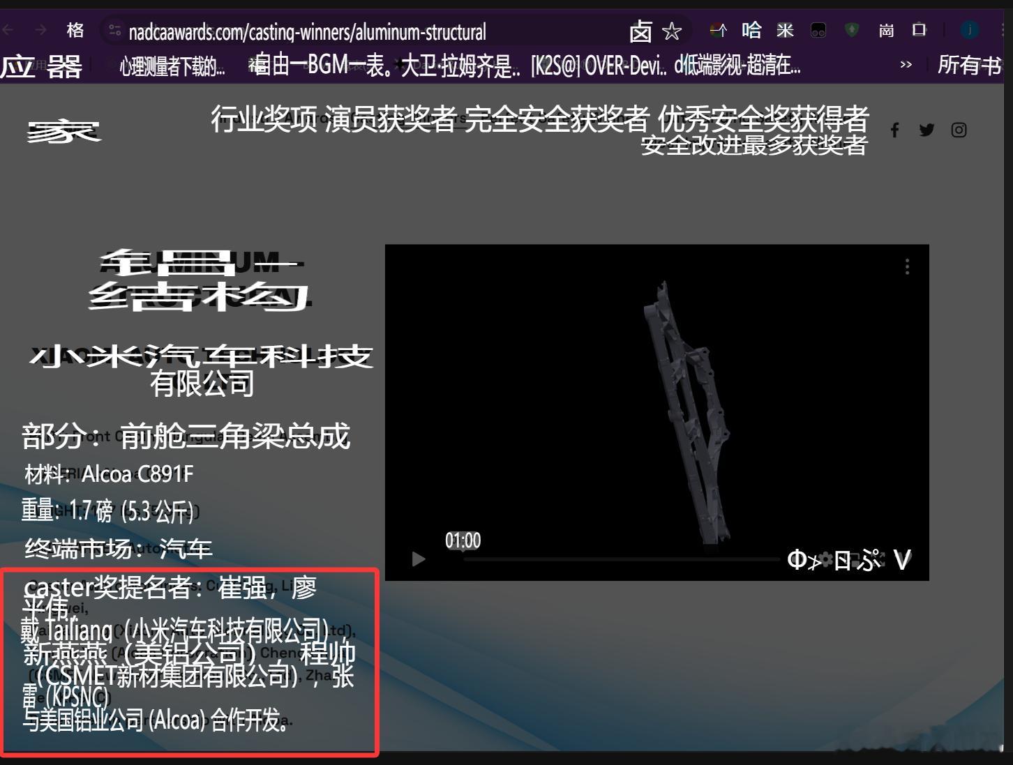昨天小米汽车发博说自己拿下了北美压铸展的最高奖项,有人看到美国铝业也说自己获得这个奖,于是开始带起了小米“盗窃”美国铝业奖项的节奏。我在核实了nadca的官网后发现,这个奖就是颁给小米的,写着小米和美国铝业合作获得,也就是两家宣传的都是一个奖项,并不存在小米“盗用”美国铝业奖项。
