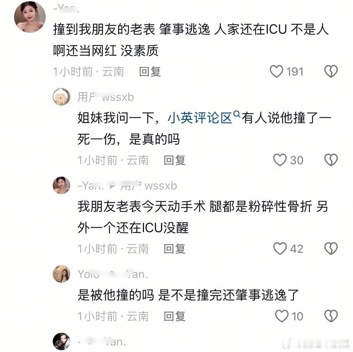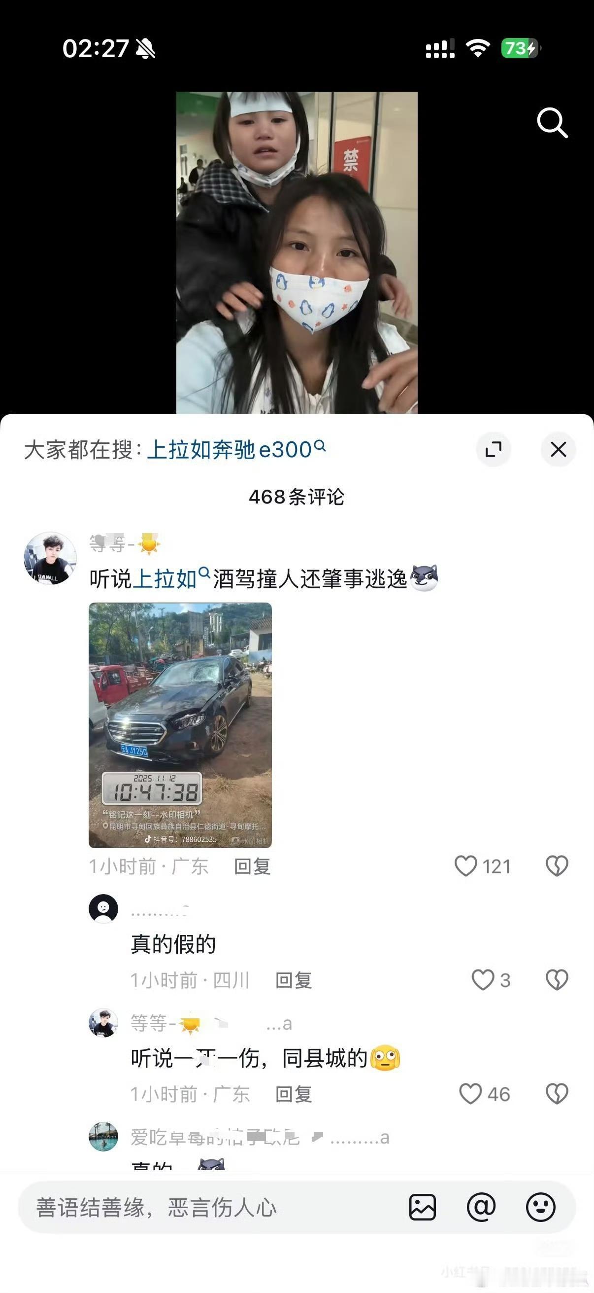 网红“小英一家”陷争议,网传上拉如涉交通事故,真相待核实 网传网红“小英的一家”成员上拉如,驾驶奔驰E300在云南同县发生事故,撞伤两人后离开,网传伤亡说法不一,暂无实锤。 涉事车辆被指是小英离婚财产分割后所赠,与账号“农村朴素”人设反差明显。目前酒驾、肇事等核心信息均来自网络,无警方、医院等权威通报证实。 若相关指控属实,涉事者可能面临刑责,但截至11月15日,云南警方尚未发布调查结果。提醒大家不信谣不传谣,静待官方核实后的通报!