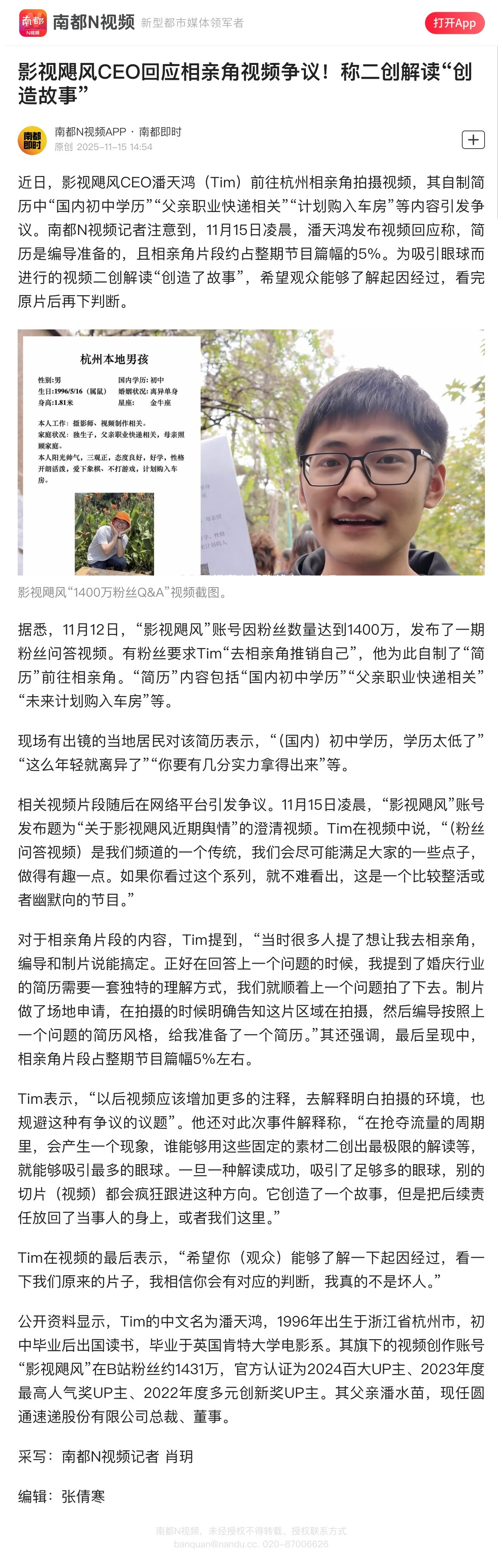 【影视飓风CEO回应相亲角视频争议!称二创解读“创造故事”】近日,影视飓风CEO潘天鸿(Tim)前往杭州相亲角拍摄视频,其自制简历中“国内初中学历”“父亲职业快递相关”“计划购入车房”等内容引发争议。南都N视频记者注意到,11月15日凌晨,潘天鸿发布视频回应称,简历是编导准备的,且相亲角片段约占整期节目篇幅的5%。为吸引眼球而进行的视频二创解读“创造了故事”,希望观众能够了解起因经过,看完原片后再下判断。南都N视频记者 肖玥