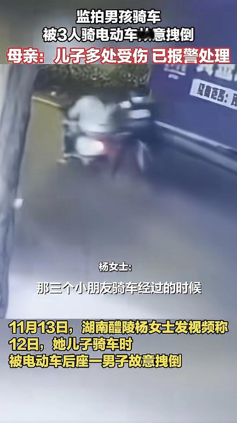 最近在湖南发生了一件让人生气的事。一个男孩在路上正常骑自行车,突然被三个骑电动车的年轻人故意拽倒,重重摔在地上。 监控拍下了整个过程。孩子的妈妈说,儿子身上多处受伤,现在已经报警处理了。 这种故意伤害别人的行为实在太恶劣了,好在有监控证据。希望警方能尽快找到那三个人,让他们承担应有的责任和应有的教训。