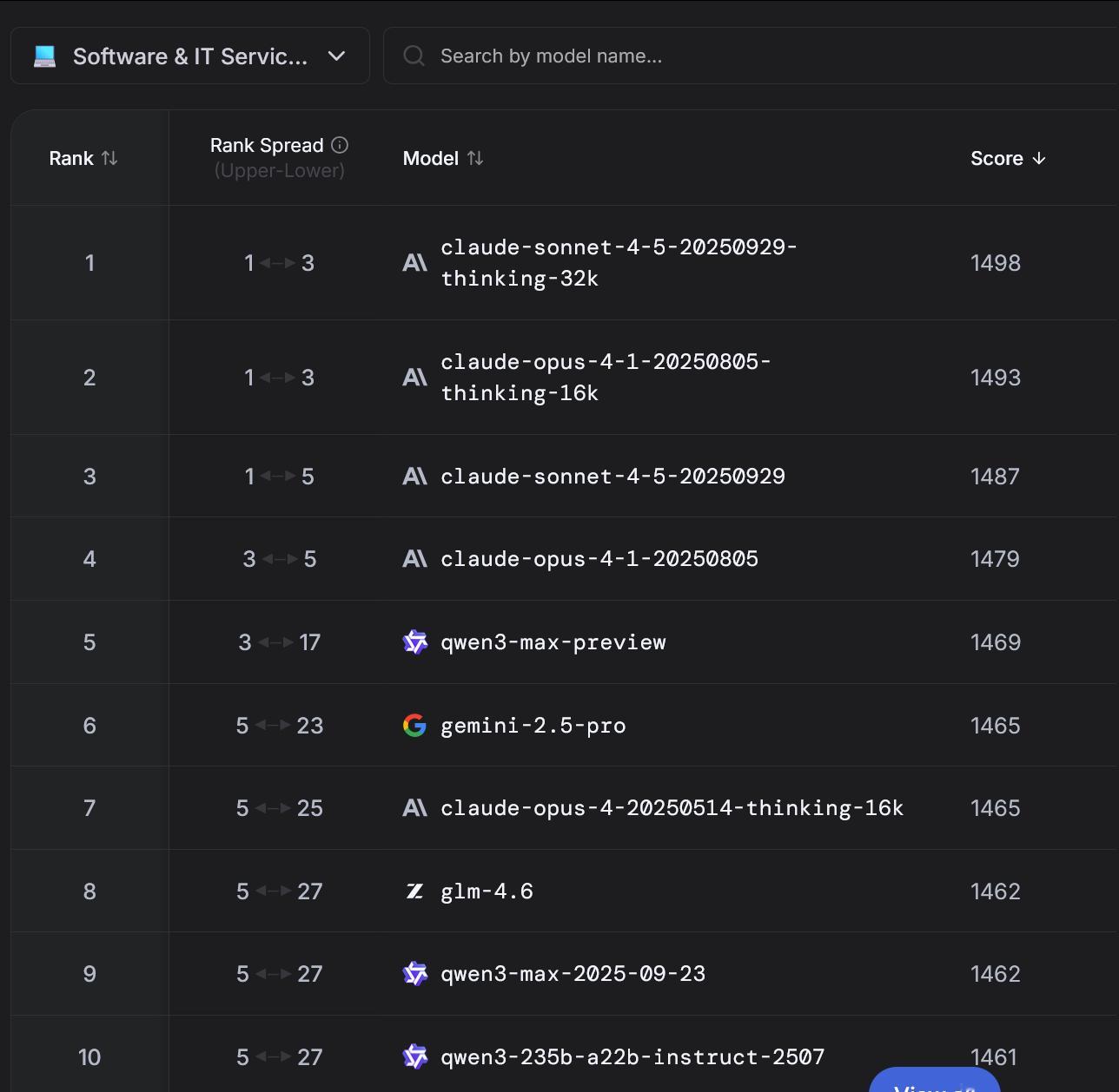 lmarena又更新排名规则了。现在加了个上限和下限,让更稳定的排在前面。俺习惯直接看expert排名,感觉更有参考一些(只选被标记为专家级的prompt)。这个规则下claude系列还是稳,如果具体到软件编程领域就更稳了(图2)。国产模型和开源模型里qwen还是第一。kimi属于上限高下限略低的那种,也不错。软件编程领域最好的开源模型是GLM4.6最近比较火的minimax m2没参评。