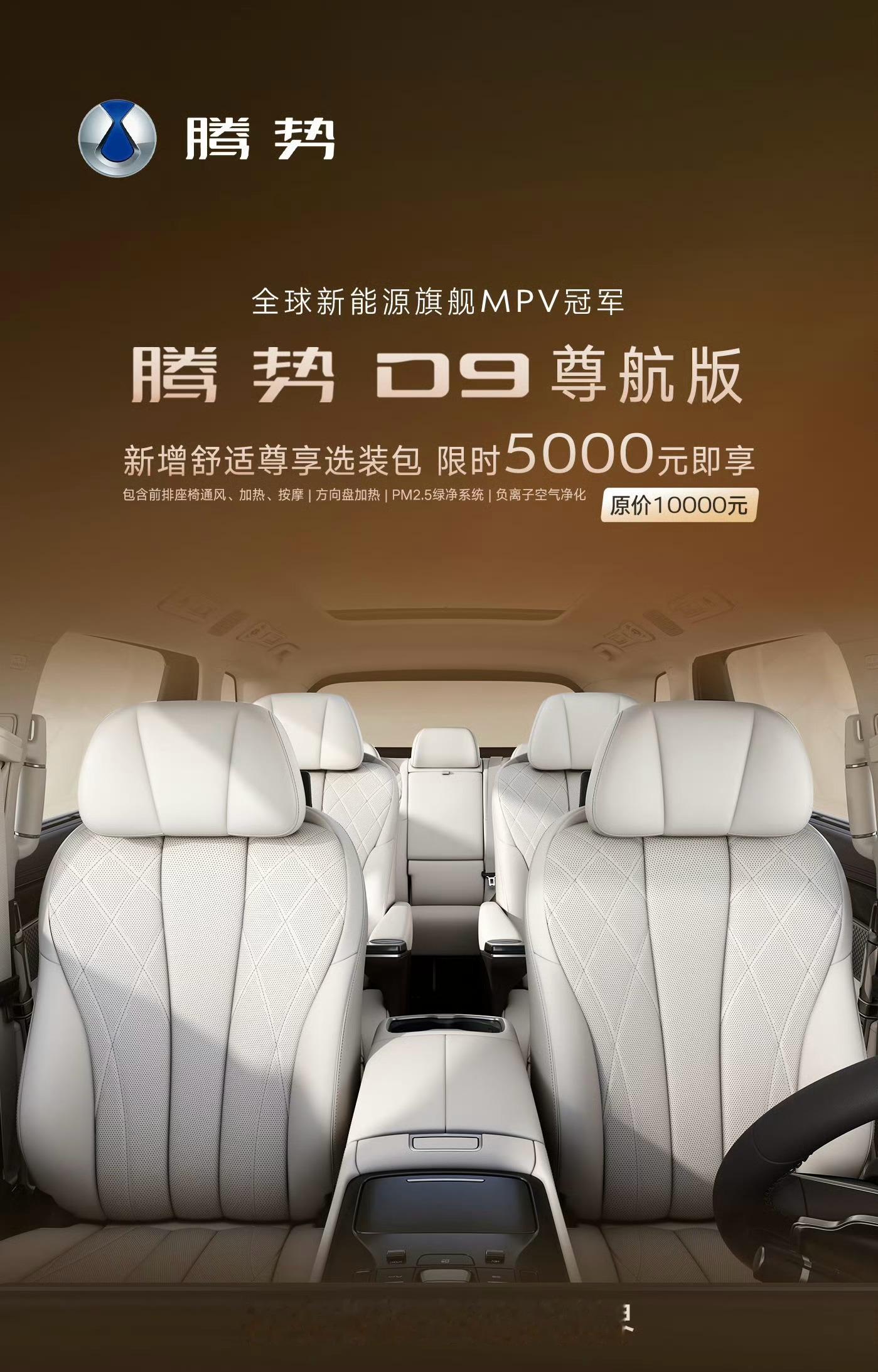 我要稳稳的幸福……腾势D9又又又拿下了销冠!直接拿下1 - 10月中国新能源MPV销量冠军,实力杠杠的!现在它家尊航版有福利,新增的舒适尊享选装包,原本要1万块,现在只要5千就能拿下。这就好比买东西突然打五折,太香了!要是你想体验智享豪华出行,现在下定,用更实惠的价格享受升级的舒适,这波机会可别错过哟~