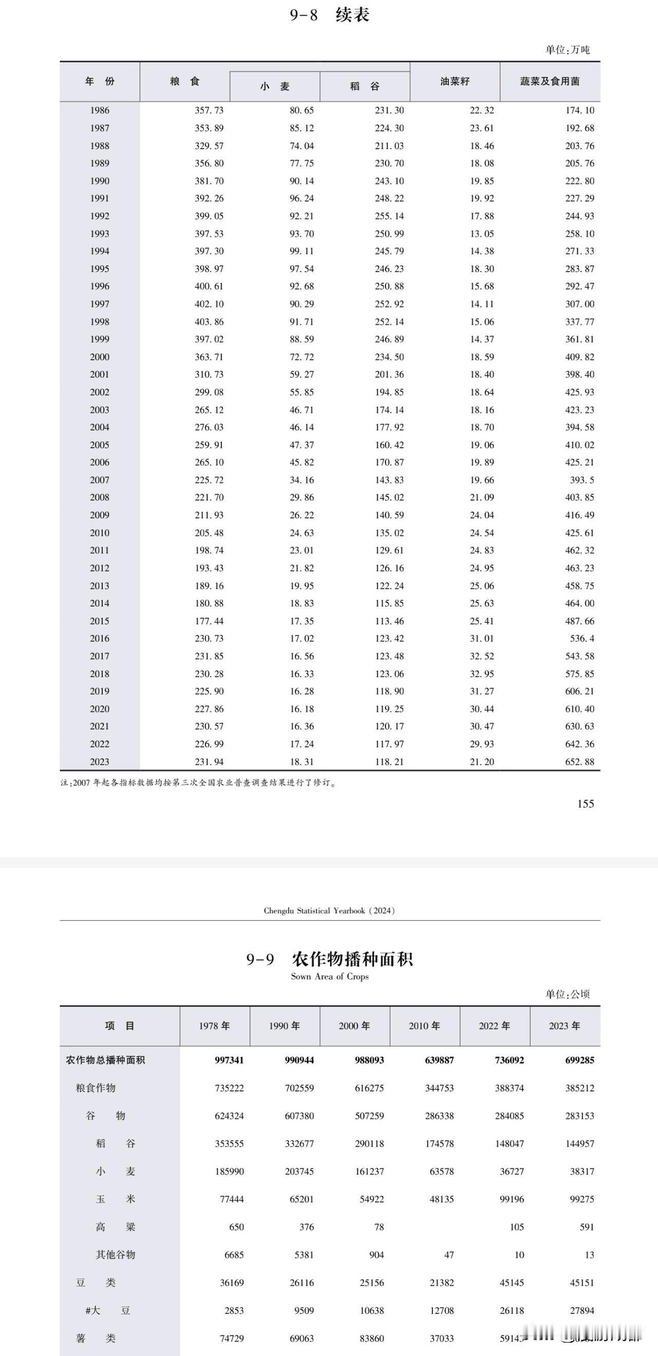 成都永久基本农田分布图及成都粮食种植面积和粮食产量变化,从中就能大概了解为何要坚决保障成都粮食安全的底线! 成都市的粮食种植面积在1978年超过1100万亩,而到2010年却只有517万亩,粮食安全问题突出!为保障成都粮食安全底线,成都进行了大规模的复耕,例如环城绿道50万亩复耕作业等,从2018年到现在成都粮食种植面积可以维持在570万亩上下! 成都人口急剧增长,粮食产量却直线下降!成都粮食总产量在1998年达到顶峰约403.9万吨,到2010年只剩下205.5万吨,从2018年到现在,基本维持在230万吨左右,粮食安全形势严峻! 现在成都也在大力进行各类“非粮化”和撂荒耕地整治工作,推进高质量农田建设,维持并提高粮食产量! 不得不说,中心城市想维持人口增长、经济发展与农业发展的平衡真的太难了,只能说八仙过海,各显神通,也怪不得很多地方在山区种粮食来置换工业用地! 大家怎么看? 备注:数据来源于成都市统计局发布的历年统计年鉴! 成都因你更新 四川