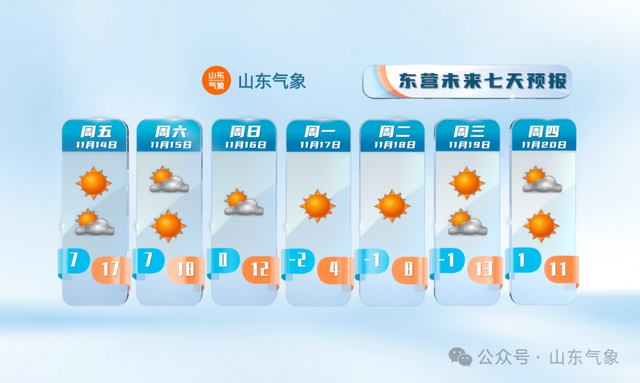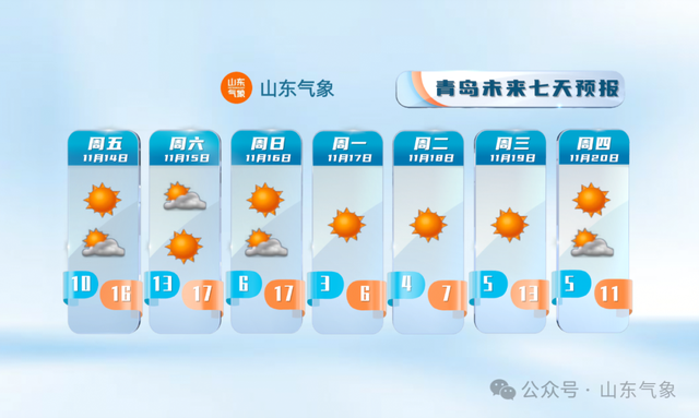 最低气温:东营、临沂、鲁中山区和半岛内陆地区6℃左右,其他地区9℃左右。