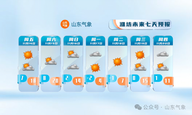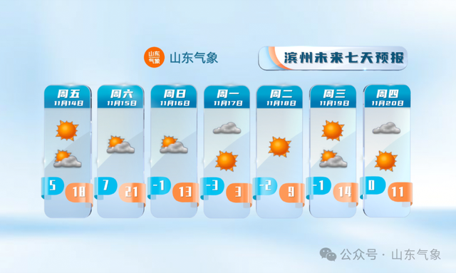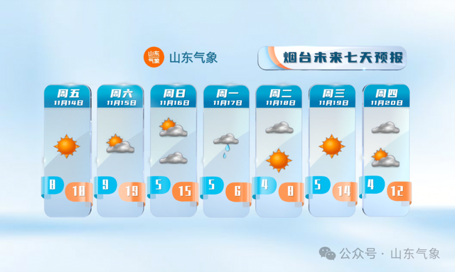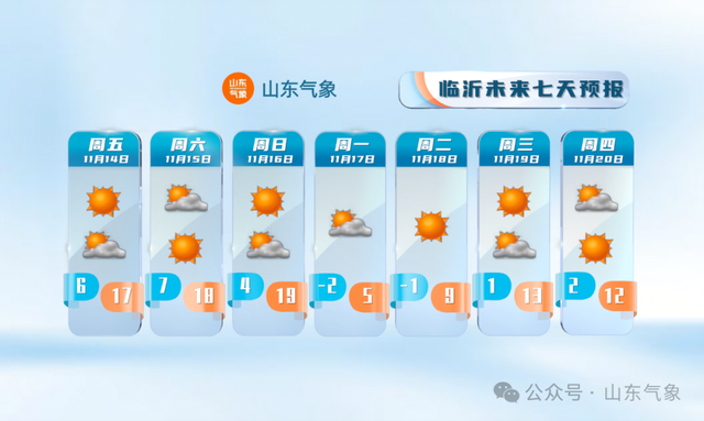 最高气温:鲁西北和鲁中山区11℃左右,枣庄、临沂和南部沿海地区18℃左右,其他地区14℃左右。