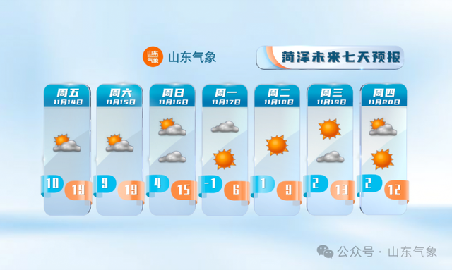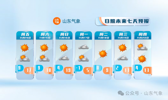 最高气温:鲁中山区16℃左右,其他地区19℃左右。