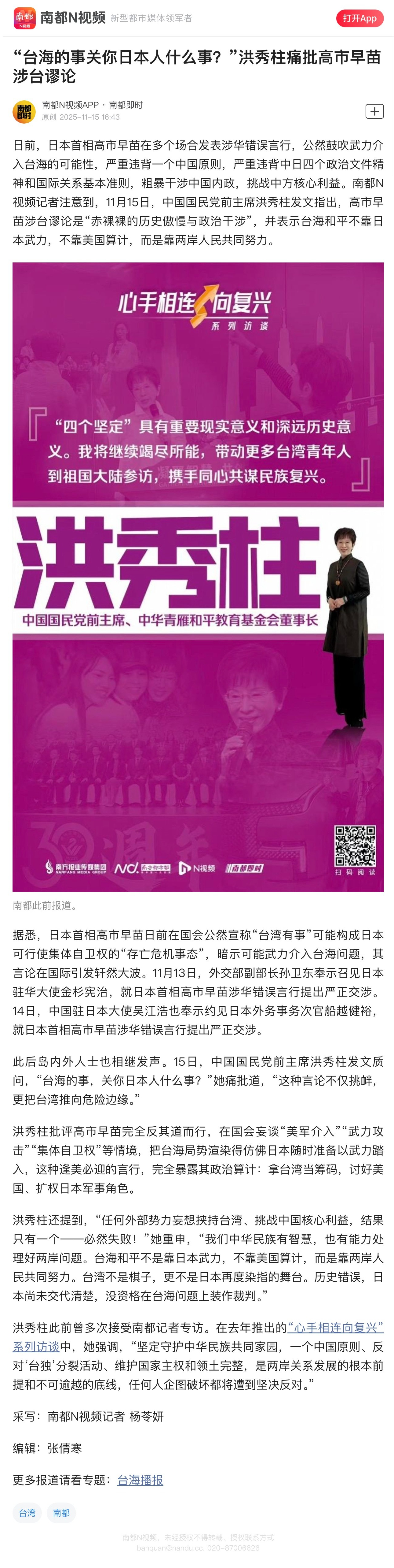 【“台海的事关你日本人什么事?”洪秀柱痛批高市早苗涉台谬论】日前,日本首相高市早苗在多个场合发表涉华错误言行,公然鼓吹武力介入台海的可能性,严重违背一个中国原则,严重违背中日四个政治文件精神和国际关系基本准则,粗暴干涉中国内政,挑战中方核心利益。南都N视频记者注意到,11月15日,中国国民党前主席洪秀柱发文指出,高市早苗涉台谬论是“赤裸裸的历史傲慢与政治干涉”,并表示台海和平不靠日本武力,不靠美国算计,而是靠两岸人民共同努力。南都N视频记者 杨苓妍