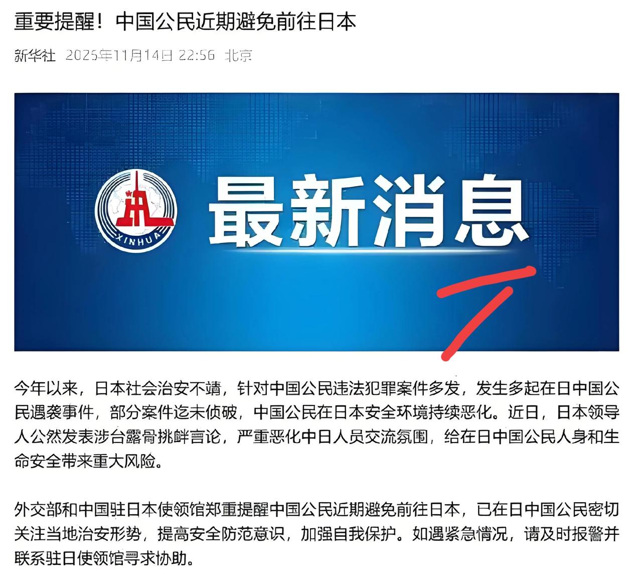 去日本旅游就是作死? 这话真不是危言耸听! 东京街头中国女生被尾随袭击。民宿老板说最近三个月发生了五起类似事件。警方反应慢得像在度假。受害者报警后连笔录都拖两天才做。监控调取困难重重。有留学生晚上回宿舍被陌生人泼液体。对方嘴里还喊着侮辱性词汇。这些案子大部分至今没破。 日本政客最近在台湾问题上疯狂刷存在感。“台湾有事就是日本有事”这种话公然说出口。这是对中国内政的赤裸裸干涉。中日关系瞬间降到冰点。民间情绪开始发酵。在日华人明显感觉周围敌意变多。 外交部和驻日使馆联合发布安全提醒。用词极其严厉:近期避免前往日本。这不是普通建议。这是红色警报。已在日本的公民必须提高警惕。少去人多复杂区域。夜间不要单独出行。随身带好使领馆联系方式。 祖国发出警告说明事态严重。我们不是要制造恐慌。是希望每个人平安回家。海外安全无小事。一句中文可能引来麻烦。一张中国面孔可能成为目标。 你还在计划去日本打卡?你还在刷日剧幻想浪漫旅行?现实比你想象残酷得多。点赞转发这条内容。让更多人看到真相。关注我。带你看清风浪背后的真相。