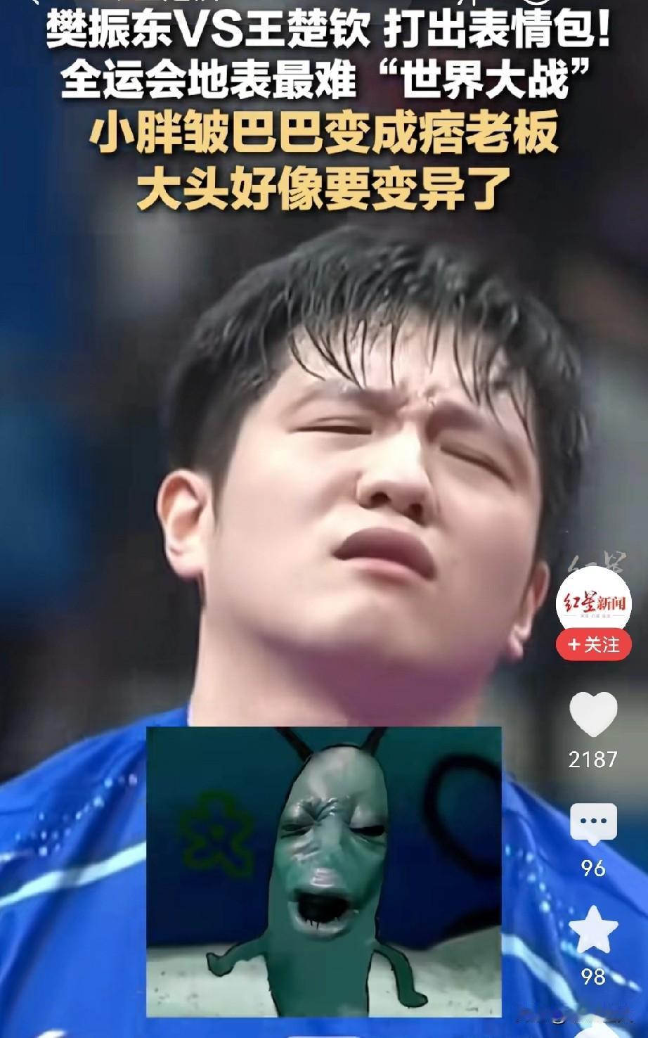 一个打得生无可恋, 一个打出痛苦面具, 全程看得人攥紧拳头!俩人事先都交手33次了,这次半决赛还是咬得死死的,六局鏖战每一分都拼到极限。 王楚钦开局就猛冲,反手爆冲快得离谱,先拿下一局不说,第三局也顶住压力赢了;可樊振东是真稳,两度落后都硬生生扳平,关键分上换发球、控节奏,直接把王楚钦给打乱了。 到后半场,王楚钦那“痛苦面具”都快焊脸上了,着急得分总失误;樊振东也没好到哪去,全程紧绷发力,脸上写满“累但必须赢”,赢球后只剩疲惫,妥妥“生无可恋”式取胜。 最后樊振东4-2拿下,六局总分才差10分!这攻防速度、力量碰撞,比世界大赛还刺刀见红。 果然最难的不是世界冠军,而是国内这些顶尖选手,这才是地表最强对决啊!