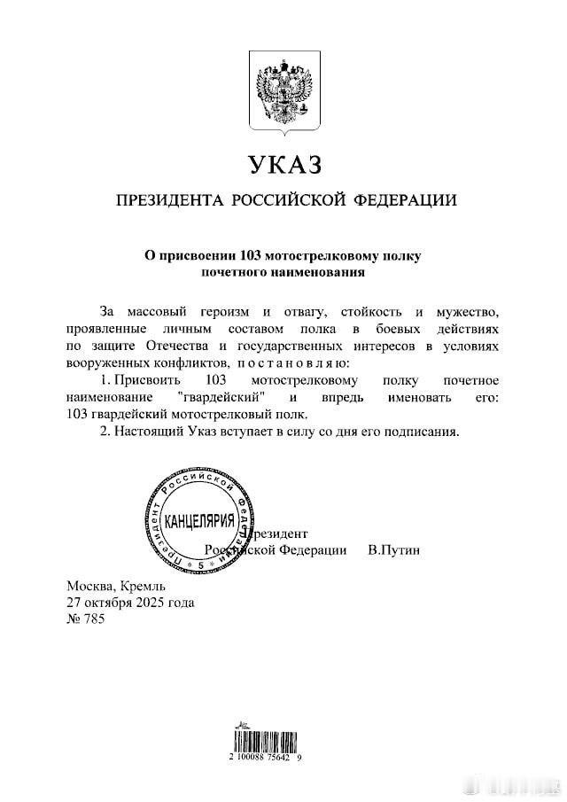 俄南部军区第8集团军第20摩步师的第33、57和242摩步团,第150摩步师的第103摩步团被总统普京授予近卫称号。至此,俄南部军区第8集团军旗下一线战斗师团全员获得近卫称号,这是全俄军首例。