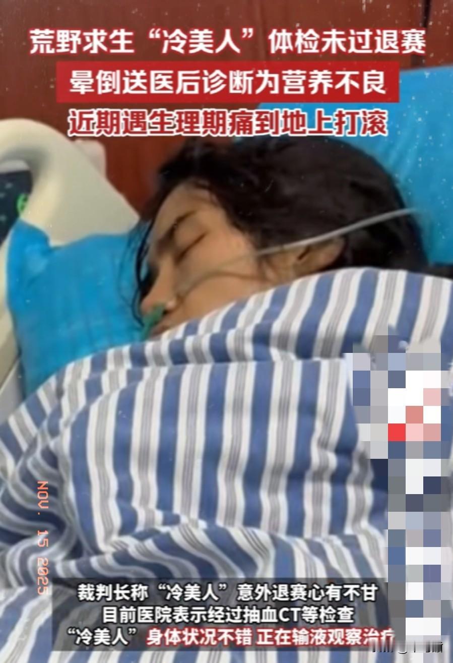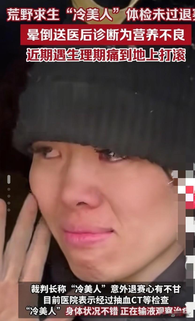 荒野求生冷美人的退赛,着实让人可惜中,又带着对她的佩服。毕竟参赛里唯一的女性代表了。 至于她的退赛还是女性生理期的疼痛,被体检出身体不适合再继续比赛了。每个人体质不一样,有的人就是很疼,有的人就跟没事人一样,不能总体概括。 但是坚持到现在,37天啊,已经很好了,拿不拿到名次已经不重要了,冷美人已经开始有了粉丝和流量,靠她的坚持赢得了口碑。 送往医院的冷美人,严重的营养不良啊,打脸很多质疑比赛真实性的人,很多网友说,节目造假,背地里有吃有喝有住的。 冷美人和其他参赛选手肉眼可见的消瘦下去,现在医院里接受治疗中,我反正是信的,这种东西医院不能造假,也希望能冷美人早点恢复体力,继续开始她的人生吧,她真的很优秀,坚韧不拔的性格,值得佩服的女性啊。 (图片来自网络视频)