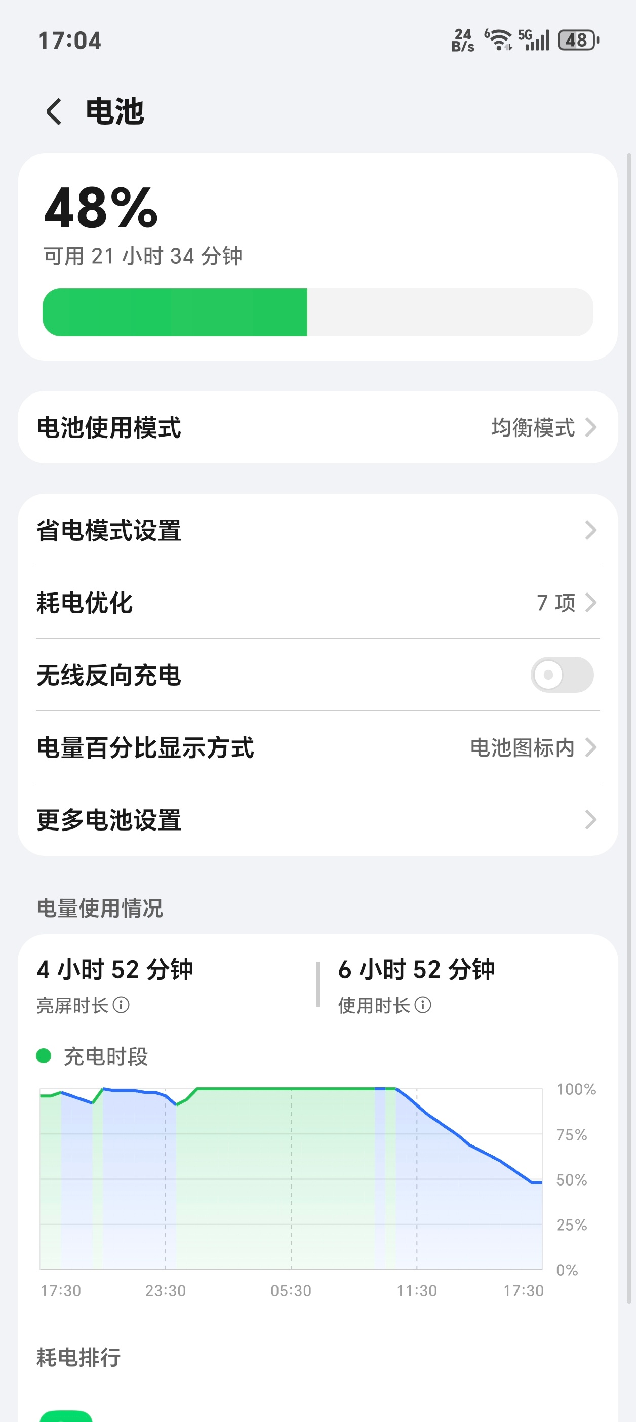 荣耀Magic8 Pro 单卡5G续航情况:早上10点满电出门,刚刚5点到家剩余48%电量,亮屏时间4小时52分,我觉得相当强了。(开全屏AOD,关智能分辨率,全局120Hz)