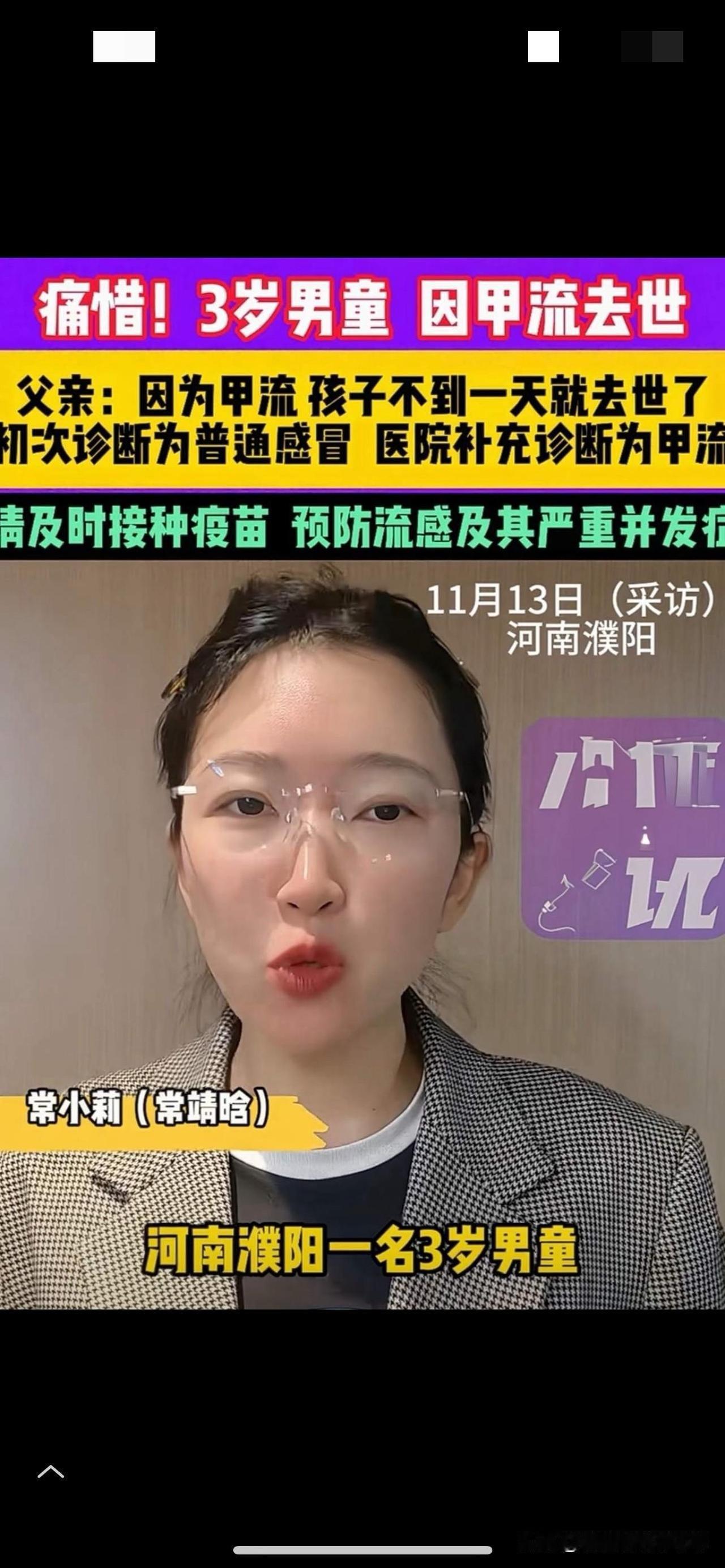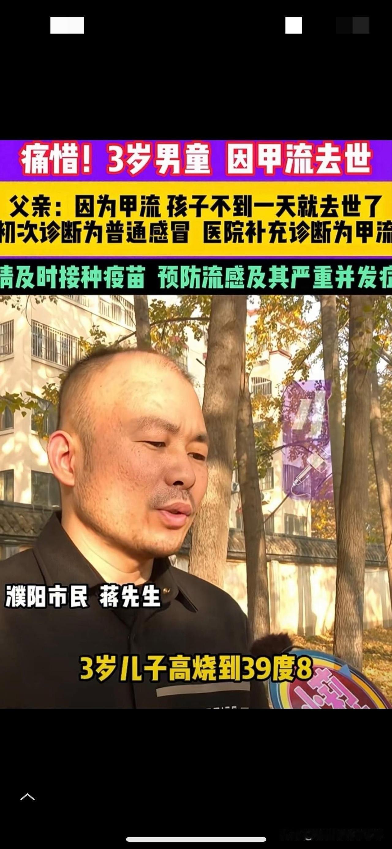 令人痛心,三岁男孩因为高烧送医院,医生出诊就是一个普通的感冒,回到家吃了退烧药都不管用, 当时是十一月十日,孩子突然发高烧,不动也不想吃,并且手脚发凉父母一摸额头,便知道孩子发烧,并且一查体温39.8度,家里慌忙连夜带着孩子去了医院的急诊,医生初次出诊只是普通的感冒,开点药就直接回家了,痛心的是谁也没想到,第二天凌晨孩子突然抽搐惊厥,直接送到医院就进了抢救室,没有抢救过来,更令人蹊跷的是医疗科学这么发达,普通感冒和甲流检测不出来?事后出了人命了才补充是甲流,谁也想不到一个三岁孩子因为这次甲流把命搭进去!实在令人心疼! 家长们真的不能大意,这波病毒来势凶猛,有些家长一点心都不长,流感病毒!不要觉得它是感冒, 医生也是有责任的,明知道发烧这么厉害,应该在急诊观察 当时就算开了奥司他韦也很难说有效。 但是最起码大概率是两种情况,一种是孩子病情发展太快;另一种是孩子早就发烧了家人没当一回事,耽误治疗时间