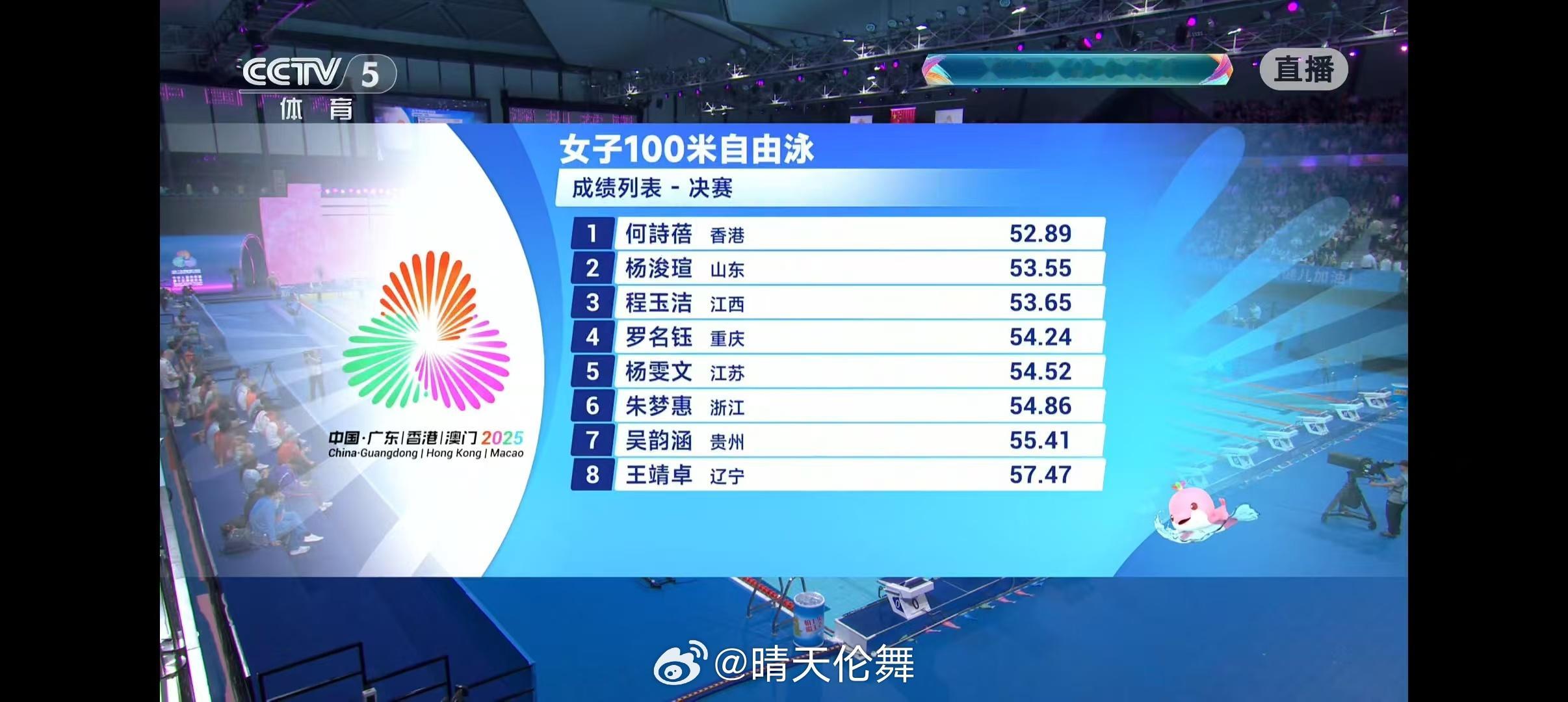 女子100米自由泳决赛🥇何诗蓓(香港) 52.89,继收获本届全运会个人第二金🥈杨浚瑄(山东) 53.55🥉程玉洁(江西) 53.65