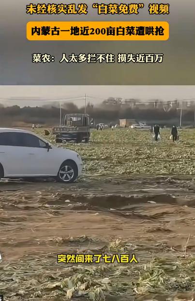 “这是什么世道!”内蒙古赤峰,男子承包了200亩地种大白菜,辛苦了一年,眼瞅着要卖钱了,万万没想到,突然来了700多人,拿着麻袋,骑着电动车,甚至开车来哄抢,男子损失高达100万,一年白辛苦了,背后的原因,竟是有人使坏,在网上发布“白菜免费”的视频,当地媒体未经证实也开始转发,男子崩溃。 “你看看这像话吗?”李先生当时站在地头,整个人都懵了。 眼前的场面,用“失控”两个字根本不够形容:电动车停的到处都是,还有开着面包车、小轿车甚至皮卡的。人群提着麻袋,一涌而入直奔他那块种了一年的白菜地,风卷残云一般把白菜往袋子里塞,根本没人听他喊,也没人管他急得差点哭出来的模样。 而导致这一切的,只是一条“未经证实”的视频。 镜头里,是一片齐整得像绿色海浪一样的大白菜地,画面干净,看上去没什么问题。但配文却扎眼:“几百亩大白菜现在都不要了!”“内蒙古欢迎您来捡白菜!” 就是这样一句话,让李先生一整年的心血,成了别人的“免费福利”。 这视频不知道哪来的,说的人也没露面,更没人查证内容真假。但就是这样一个东西,被个别媒体、一些账号转发得飞快,评论区热热闹闹,大家以为真有农户“烂地式处理”,以为是“随便捡、捡多少算多少”。 可李先生当时根本不知道有人把他的土地当成了“免费菜市场”。 他那两百亩大白菜,本来已经联系好了销售渠道,价格谈妥,时间敲定,等着日子到了就陆续采收、装车、出货。那是他这一年的收入,是他家里主要的经济来源,是他辛苦、劳作、盼头、坚持的全部寄托。 偏偏就在准备收获的前几天,事情彻底变了味。 等人潮散去,整个菜地像遭过龙卷风。那一刻,他坐在地头,不说话,也不骂人,只是死死盯着脚下的白菜根。风吹得他发抖,可他心里比天气还冷。 有网友说:“不就是几个白菜吗?”但问题不是白菜,是规则,是边界,是尊重。毕竟农民种地的辛苦不是一句空话,春天播种、夏天浇水、秋天赶天气、冬天封冻前抢收,每一个环节都要钱、要汗水、要体力。 目前,当地已经介入调查,也在和李先生协商处理。但无论结果如何,这件事已经给所有人敲响了警钟:网络虽然可以畅所欲言,却不能胡编乱造,每个人都要对自己的言行举止负责任。 希望这次调查能够给李先生一个明确的交代,也希望这种事不再发生在任何农民身上。毕竟土地是他们的命根子,辛勤劳动换来的收成,绝不是谁想拿就能拿。 信息来源: 央广网丨网络谣言引发哄抢,“白菜”被“白采”,种植户的损失谁来赔? 文丨小王 编辑丨史叔