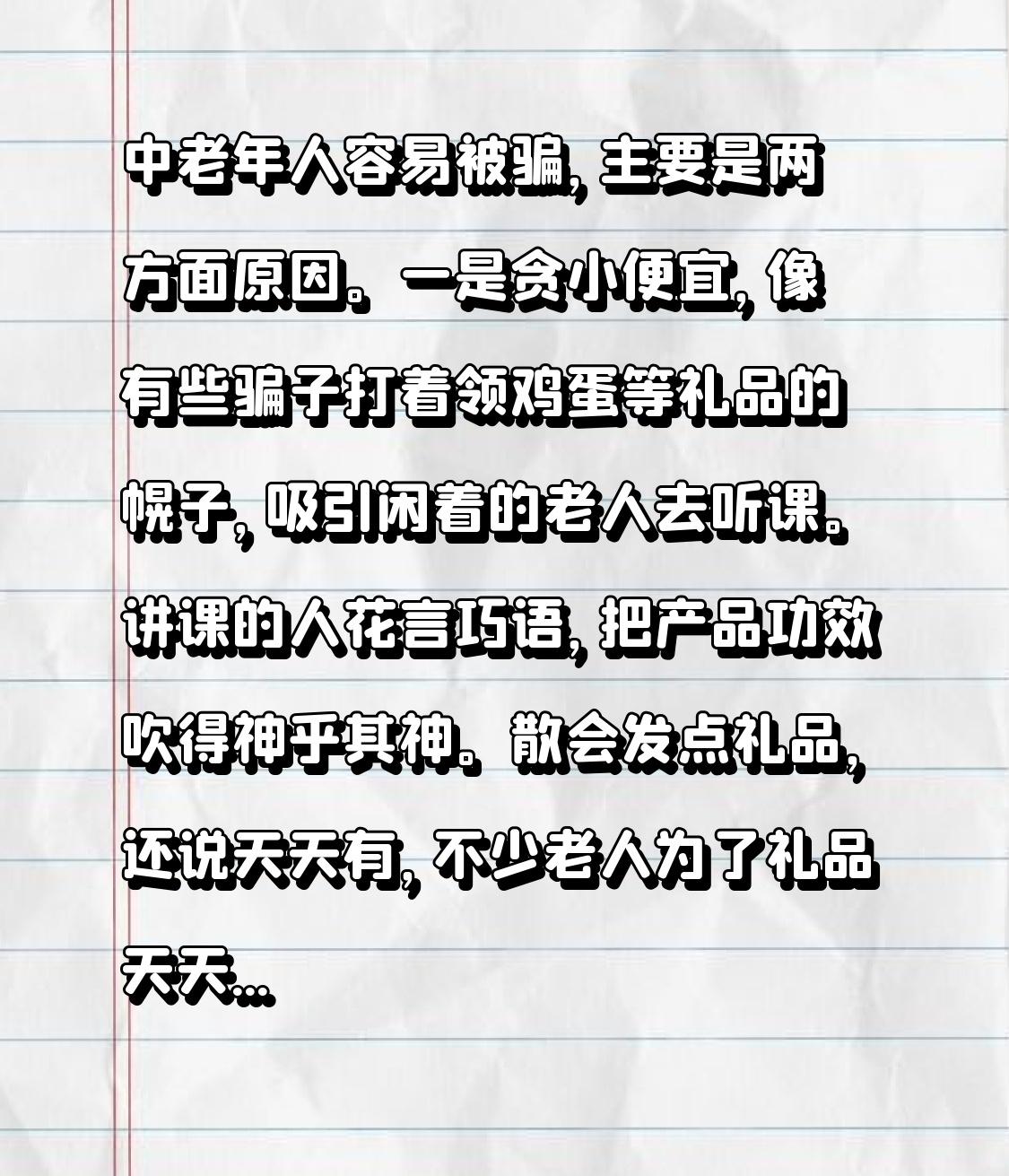 中老年人容易被骗,主要是两方面原因。一是贪小便宜,像有些骗子打着领鸡蛋等礼品的幌子,吸引闲着的老人去听课。讲课的人花言巧语,把产品功效吹得神乎其神。散会发点礼品,还说天天有,不少老人为了礼品天天去,听着听着就掏钱了。 二是想多活几年的心理。骗子抓住老人这一心理,宣传保健品、保健器械能治百病、延年益寿。有些经济条件好的老人就心动了,上万的器械眼睛都不眨就买。我和老伴就坚持不贪小便宜,也不信那些夸大宣传,毕竟天上不会掉馅饼,好东西政府肯定会推广。
