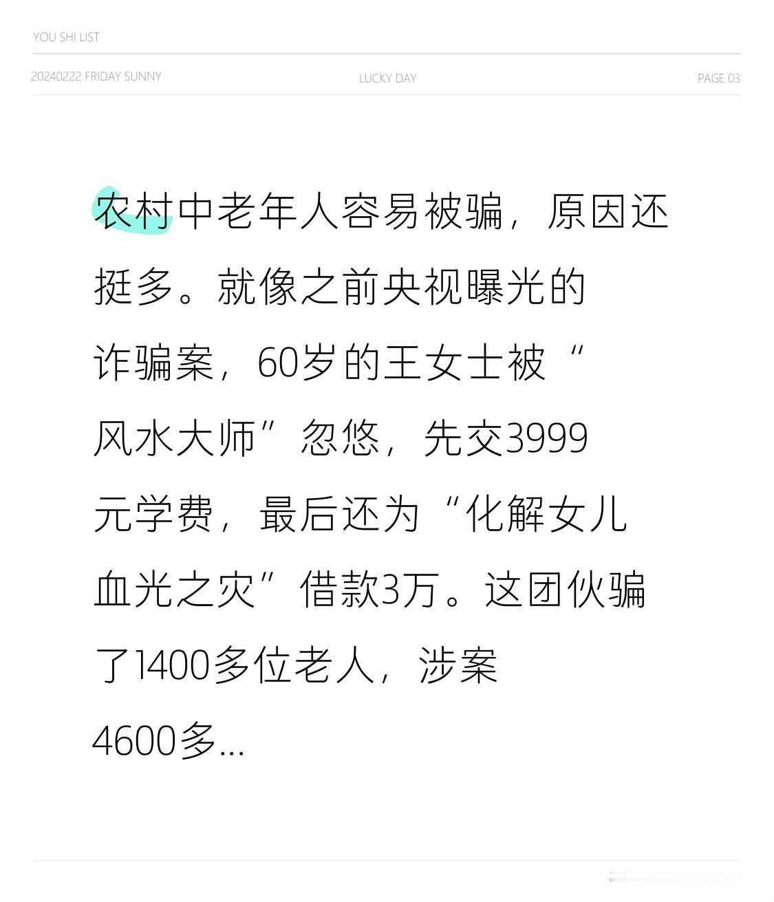 农村中老年人容易被骗,原因还挺多。就像之前央视曝光的诈骗案,60岁的王女士被“风水大师”忽悠,先交3999元学费,最后还为“化解女儿血光之灾”借款3万。这团伙骗了1400多位老人,涉案4600多万。 每到年关,老家有卖净水器、按摩仪的不法商贩,天天给老人讲孝道、送东西套近乎,最后把网上500 - 600元的东西,以2800 - 3000元卖给老人。而且很多老人用智能手机时,不小心点个链接或广告就可能中招。他们缺少防骗知识,又容易被嘘寒问暖打动,所以才总陷入骗子的陷阱。