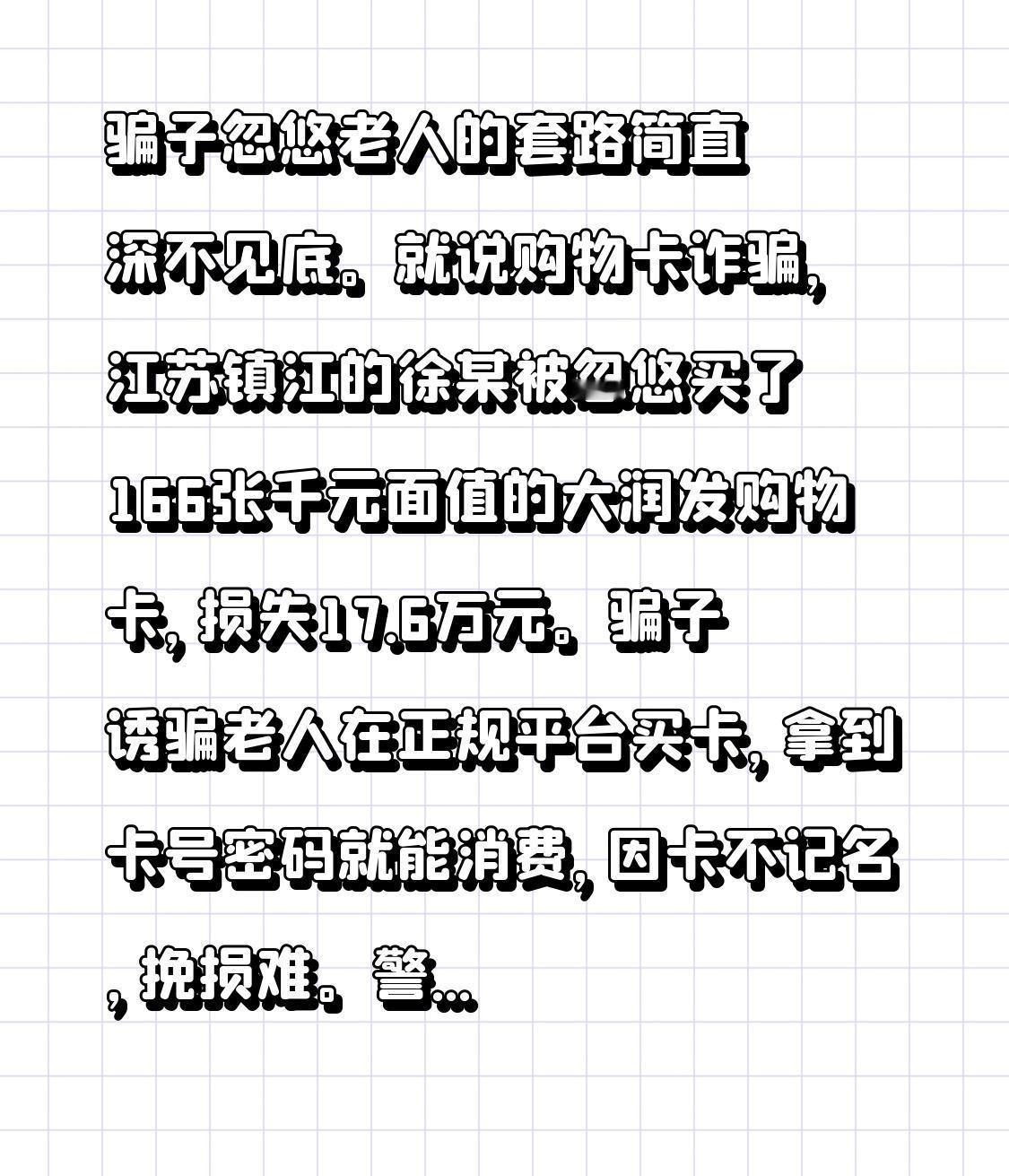 骗子忽悠老人的套路简直深不见底。就说购物卡诈骗,江苏镇江的徐某被忽悠买了166张千元面值的大润发购物卡,损失17.6万元。骗子诱骗老人在正规平台买卡,拿到卡号密码就能消费,因卡不记名,挽损难。警方发现时,徐某还准备再借20万转账。 还有保健品骗局,成本11.5元的食品摇身变成5000元一疗程的“神药”。“伪专家”车接车送老人去听讲座,编造科研成果忽悠。北京就打掉这样一个团伙,16人被采取刑事强制措施。老人容易轻信,骗子就利用这点,手段层出不穷,真让人愤怒!