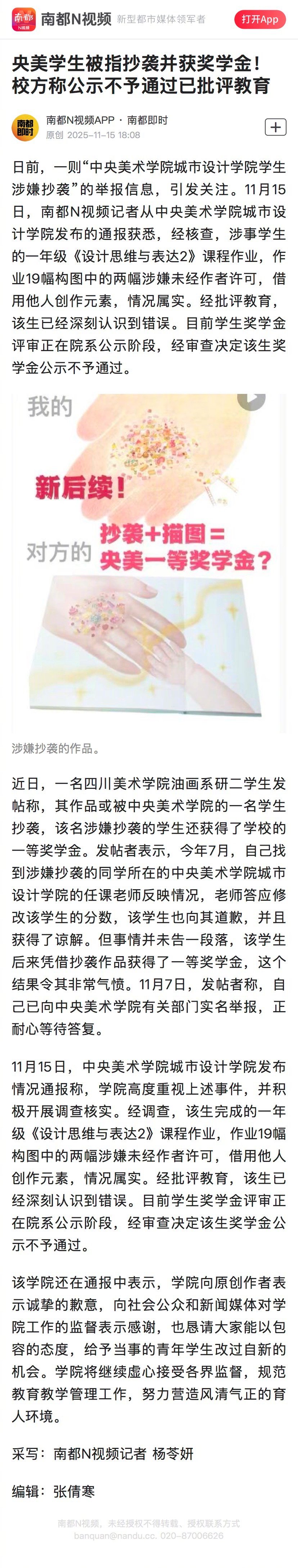 【央美学生被指抄袭并获奖学金!校方称公示不予通过已批评教育】近日,一名四川美术学院油画系研二学生发帖称,其作品或被中央美术学院的一名学生抄袭,该名涉嫌抄袭的学生还获得了学校的一等奖学金。11月15日,南都N视频记者从中央美术学院城市设计学院发布的通报获悉,经核查,涉事学生的一年级《设计思维与表达2》课程作业,作业19幅构图中的两幅涉嫌未经作者许可,借用他人创作元素,情况属实。经批评教育,该生已经深刻认识到错误。目前学生奖学金评审正在院系公示阶段,经审查决定该生奖学金公示不予通过。南都N视频记者 杨苓妍