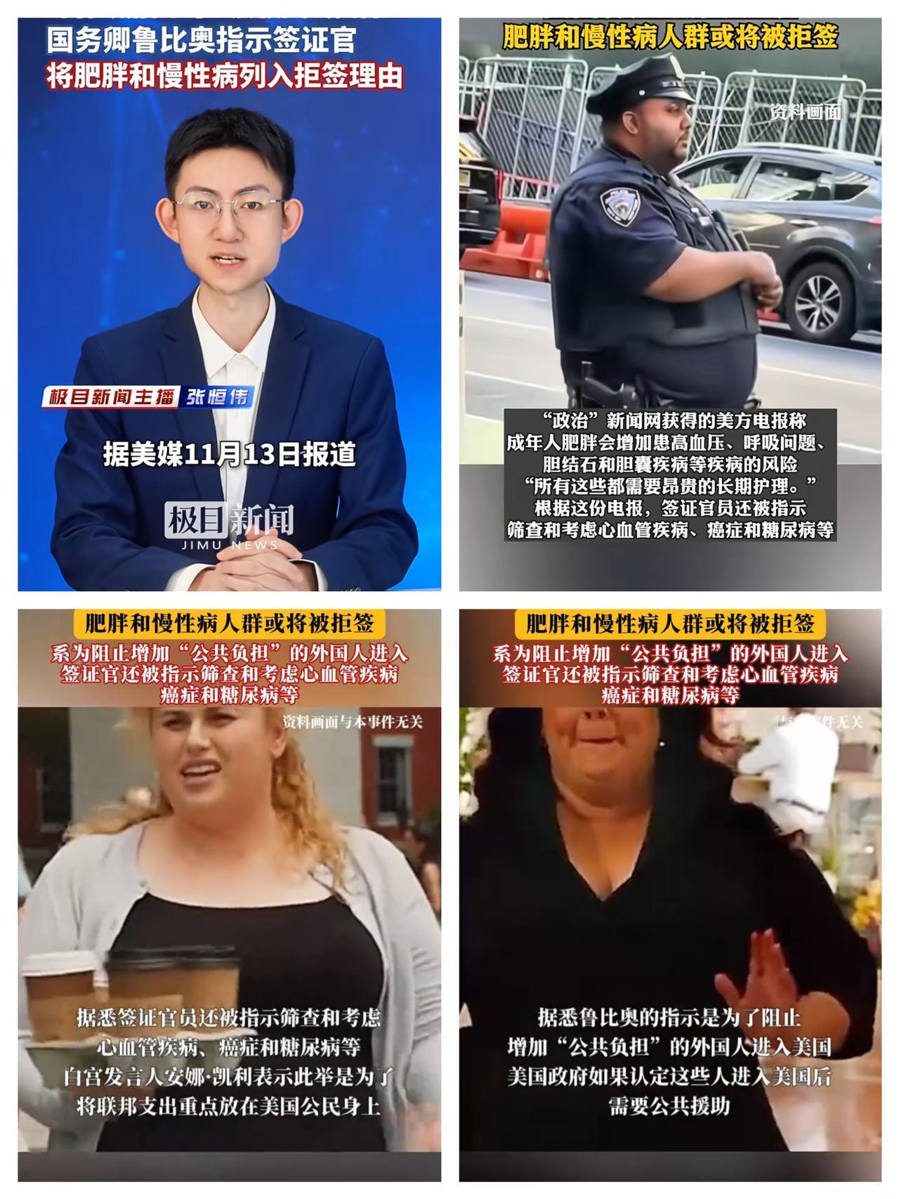 突发!美国签证又出狠招,肥胖、慢性病直接拒签! 家人们注意了!美国签证最近又添新门槛,肥胖和各类慢性病居然成了拒签理由,这波操作属实让人没想到! 据美国“政治”新闻网11月13日消息,国务卿鲁比奥已明确指示签证官,今后审核外国人签证申请时,必须把肥胖及慢性疾病纳入拒绝范畴。官方给出的说法是,要阻止这些可能成为“公共负担”的人入境,避免他们消耗美国的公共援助资源。 美方内部电报显示,成年人肥胖容易引发高血压、呼吸问题、胆结石等多种疾病,这些都需要高额长期护理费用,美国疾控中心的数据也成了这一政策的“依据”。除了肥胖,心血管疾病、癌症、糖尿病等患者也被重点筛查,签证官得逐一核对相关健康信息。 白宫发言人安娜·凯利还特意强调,此举是为了把联邦支出优先用在美国公民身上,防止外籍人士占用本国医疗资源,说白了就是“先顾着自己人”。 这一政策直接给计划赴美的申请者提了个醒,今后申请美国签证,不光要准备好各类材料,自身健康状况也得重点关注,尤其是体重和慢性病相关的指标,很可能成为能否顺利获签的关键。想要赴美出行的朋友,可得提前做好相应准备了!
