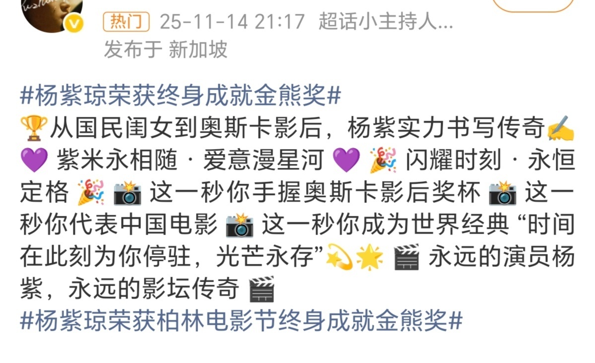 历史再次重演,恭喜杨紫获得柏林电影节终生成就奖,有这样的粉丝真的不可能“琼”。