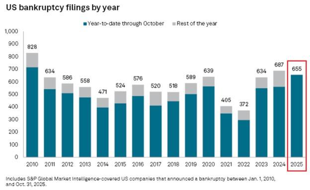 今年以来,已有 655 家美国大型企业破产,由于今年尚未结束,可以预见,这极有可能将创美国 15 年来新的最高纪录。 这一数字已超过 2011 年以来除 2024 年外的所有年度破产总数。自 2022 年起,美国企业破产数量增幅接近+100%。 数据显示,10 月有 68 家美国大型企业申请破产,9 月 66 家,8 月 76 家——至少是 6 年来单月最高数值。 2025 年美国工业领域破产数量最高,达到 98 起;其次是可选消费品和医疗保健行业,分别有 80 起和 45 起。 美国大企业破产正以危机级速度蔓延。 (数据来自S&P)