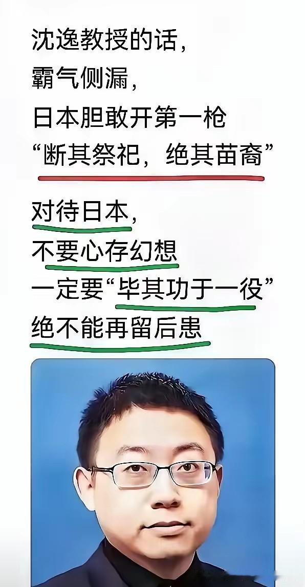 沈逸这句千年檄文燃炸全网!对日警告藏汉唐风骨: 断其祭祀,绝其苗裔! 华夏自古内敛守成,却从不是任人拿捏的软柿子!大汉奋二百年神威,剑指匈奴,打得其西逃融散,从此世间再无匈奴族号;盛唐挥斥方遒,力破突厥,使其远遁欧亚,北方边境永绝突厥之患! 这就是华夏刻在骨子里的铁律:人不犯我,我不犯人;人若犯我,虽远必诛!仇恨能延续百年,复仇更能代代相传,敢欺我华夏者,终难逃灭族亡种的下场! 别觉得这是危言耸听,更不是嗜血好战!这句话藏着的,是华夏文明一次次在亡国灭种边缘挣扎后,用鲜血换来的生存智慧。 你敬我一尺,我还你一丈;你若蹬鼻子上脸,我便让你万劫不复!古往今来,从来如此,没有例外。 就说大明万历年间,倭寇屡次犯我东南沿海,烧杀抢掠无恶不作,百姓流离失所,白骨露于野。 戚继光带着戚家军枕戈待旦,“封侯非我意,但愿海波平”的誓言犹在耳畔,刀光剑影里斩尽倭寇气焰,终让东南海疆重归安宁。 那些叫嚣着“三个月灭亡中国”的日寇,七十多年前何等嚣张?南京城里的血债、华北平原的焦土,每一笔都刻在民族的伤痕里。 可最终呢?华夏儿女同仇敌忾,用小米加步枪打出了民族脊梁,让侵略者签下投降书,滚回了弹丸之地! 沈逸这句警告,不是凭空喊出的狠话,是对历史的敬畏,更是对现实的警醒!看看如今的日本右翼,一边否认南京大屠杀,一边篡改教科书美化侵略。 一边拉着“盟友”搞军演,一边在台海问题上指手画脚,这不就是好了伤疤忘了疼,又想重蹈覆辙? 华夏的内敛,是对和平的珍惜,不是对挑衅的纵容;华夏的守成,是对家园的守护,不是对侵略的退让! 大汉击匈奴,不是为了扩张领土,是为了阻止南下掠夺;盛唐破突厥,不是为了称霸欧亚,是为了守护边境安宁。 我们从来没想过主动招惹谁,但也绝不允许谁再把战火引到华夏大地!“断其祭祀,绝其苗裔”,从来不是主动加害,而是当侵略者步步紧逼时,不得不亮出的终极底线。 就像猎人不会主动猎杀猎物,但当豺狼扑向家门,必然会扣动扳机!日本右翼真该好好翻翻历史书,那些曾经欺辱华夏的势力,下场从来都是一致的——灰飞烟灭。 现在的华夏,早已不是当年那个能被轻易侵犯的国家。东风快递全域覆盖,航母编队劈波斩浪,科技实力日新月异,民族凝聚力空前强大。 我们有足够的实力守护家园,更有足够的底气回应任何挑衅!你敢来犯,我们就敢接招,而且一旦出手,必让你再无翻身之力! 有人说这话太“狠”,可对侵略者的仁慈,就是对同胞的残忍!当年如果先辈们心慈手软,哪有如今的国泰民安? 沈逸的这句檄文,燃的是民族血性,醒的是麻木之人,警告的是蠢蠢欲动的豺狼!华夏儿女爱好和平,但从不畏惧战争。 我们珍惜当下的安宁,更铭记历史的教训。谁敢触碰我们的底线,谁就必须做好承受后果的准备! 这不是威胁,是历史的必然,是正义的审判!汉唐风骨从未远去,华夏血性永远滚烫! 各位读者你们怎么看?欢迎在评论区讨论。