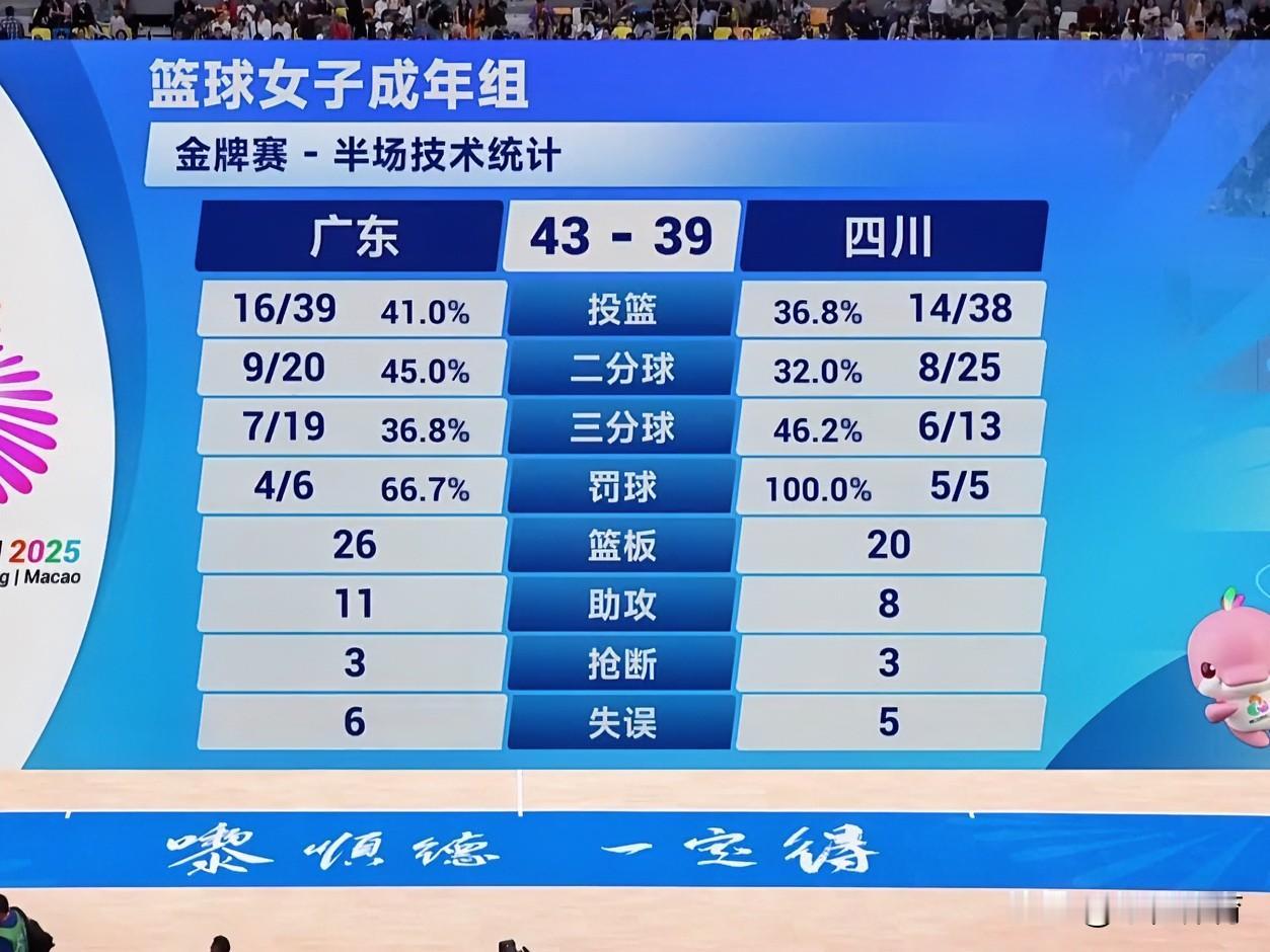 四川女篮真的赢不了 昨天晚上我就说:广东女篮与四川女篮五五开,广东的战术克制四川,快攻转换和三分球是广东取胜的法宝。 还好多人说广东打不赢四川,单纯有身高没用的,现代篮球打的比较快,有速度才有优势,看杨翰森在NBA就是体能差、移动速度慢,就很难立足的。 半场结束:广东43-39四川 广东女篮:陈明伶贡献12分5篮板2助攻,杨舒予10分,黄思静7分7篮板,杨力维5分5篮板。四川女篮:韩旭0分2篮板,李梦2分,李缘5分3篮板2助攻,王思雨8分。四川的几大国手发挥都不佳,退步太明显。 下半场希望找回点状态,给球迷带来一场精彩的比赛!