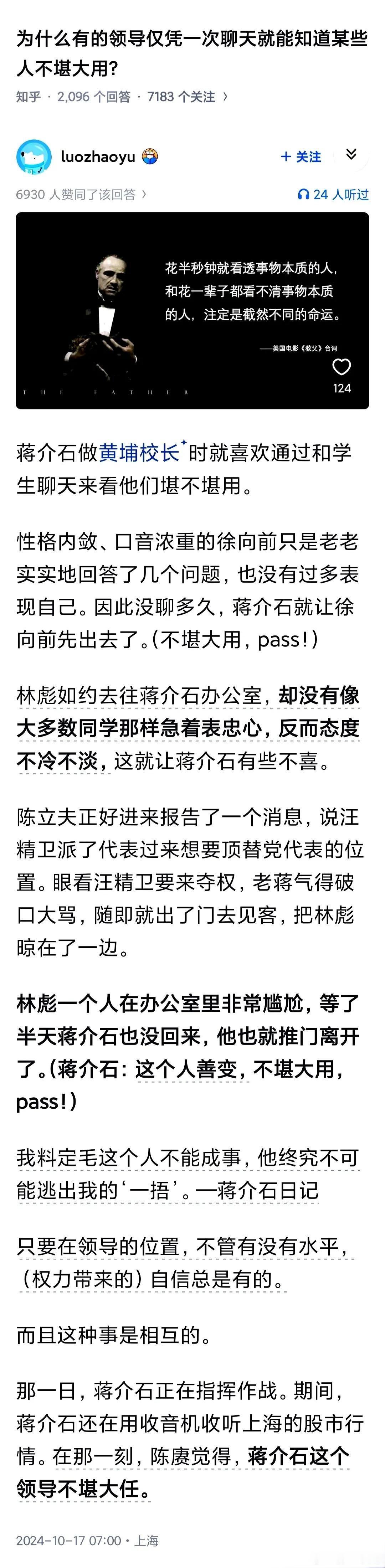老蒋看人还以为行,结果把很多人都看跑了:觉得抗战爆发后苏联派来的援华军事顾问崔可夫水平不堪任用呢!这人是著名斯大林格勒的绝境抗战神话指挥员。他还认为林徐两帅不堪大用,重庆会谈也赌教员不敢去重庆,结果去了,措手不及。老蒋几次著名错判:教员难成大事、崔可夫是个草包、杜鲁门难胜总统。难怪陈大将一看他战争期间还在听股市就知道他难以大任