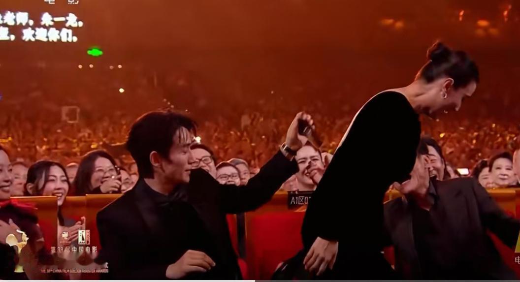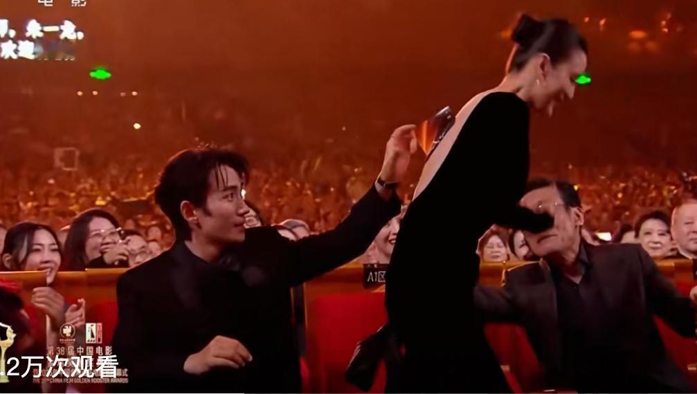 朱一龙帮宋佳摘掉黏在背上的姓名贴! 笑死😂,竟然上热搜了。 在今晚金鸡奖主持人点兵环节,主持人点到宋佳时,她一起身后背上竟然沾上了姓名贴,旁边的朱一龙立马帮她摘掉了,这一举动被镜头记录下来。 随后就上了热搜,看来哥哥是真火啊,热点就这么跟着他。