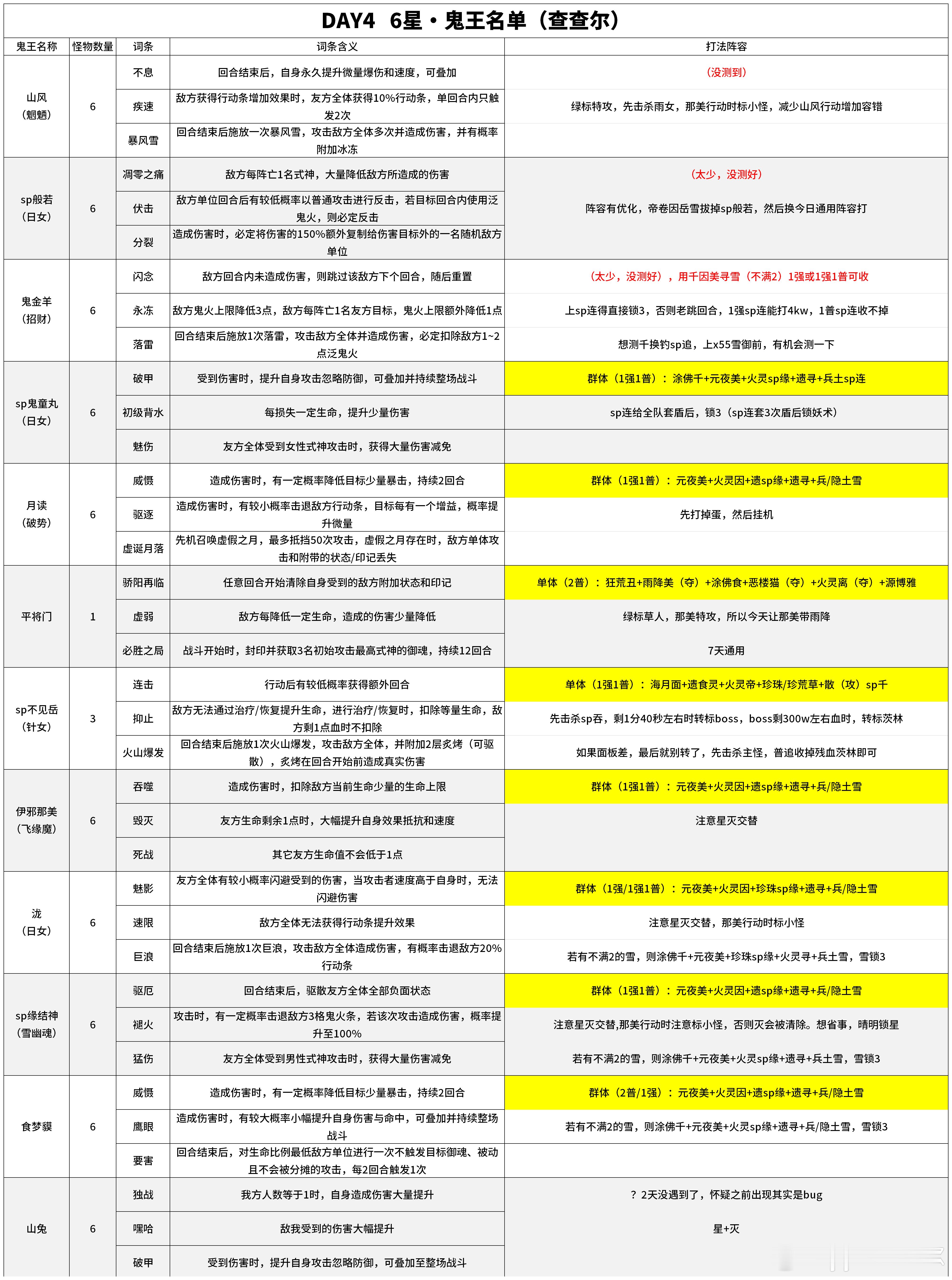【超鬼王】Day4六星鬼王词条+全打法(体验服)■day4是雪御前、sp连特攻。测到的鬼王基本都是1强1普带走,差sp般若、山风、鬼金羊没测到■x55雪御前只能绑定因幡一起上场,长线伤害不如带千姬的雪御前打的高。但不会差的特别离谱■day1消耗了65次魂王(神罚)次数,刷满鬼王门票。day2刷了180次觉醒刷满,day3刷了137次魂土(悲鸣)刷满,day4刷了82次悲鸣。明天测测契灵■阵容码、文字码和通用阵容我都做好了(每个鬼王我都单独写了配置+打法),大家也不用这么早就开始做阵容,周一我先发一版阵容。如果体服调整了难度,那我周三测好再给大家发