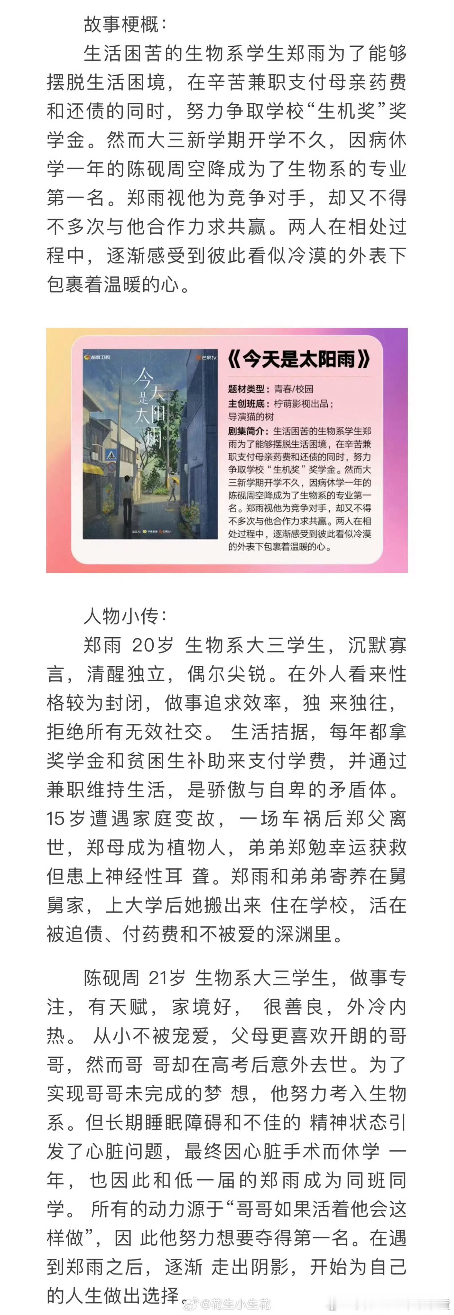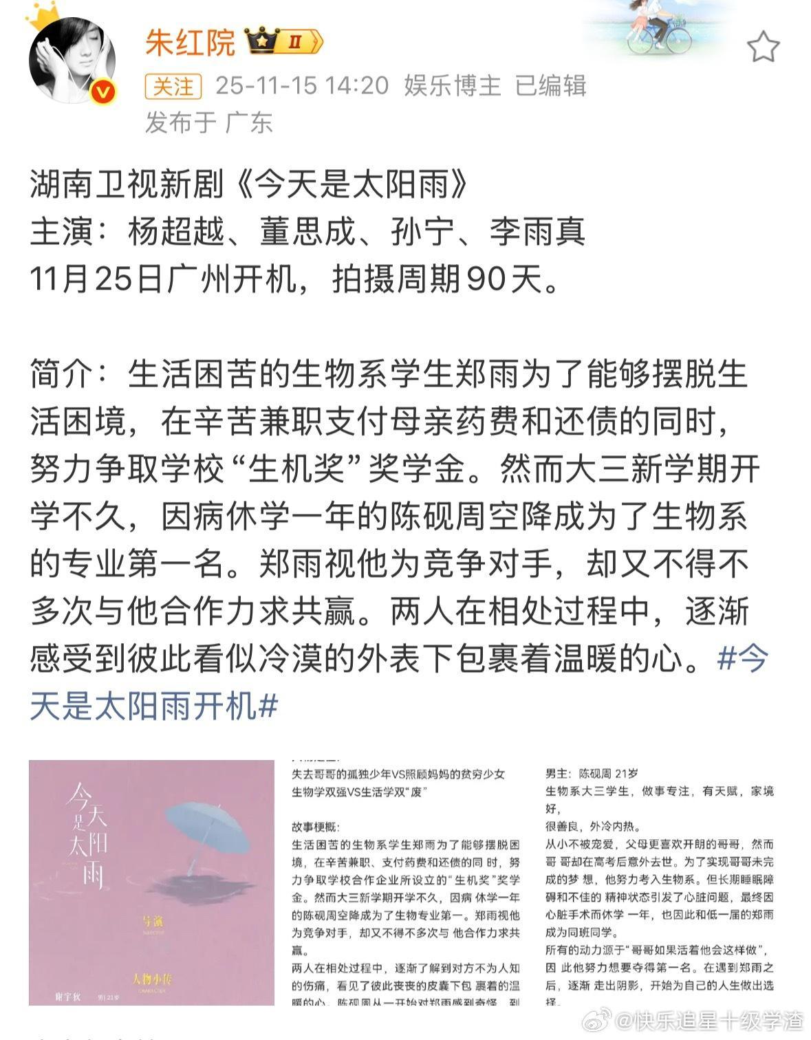 猫的树《今天是太阳雨》主演是杨超越、董思成、孙宁、李雨真,预计11.25广州开机,拍摄周期90天。超想看这部!!