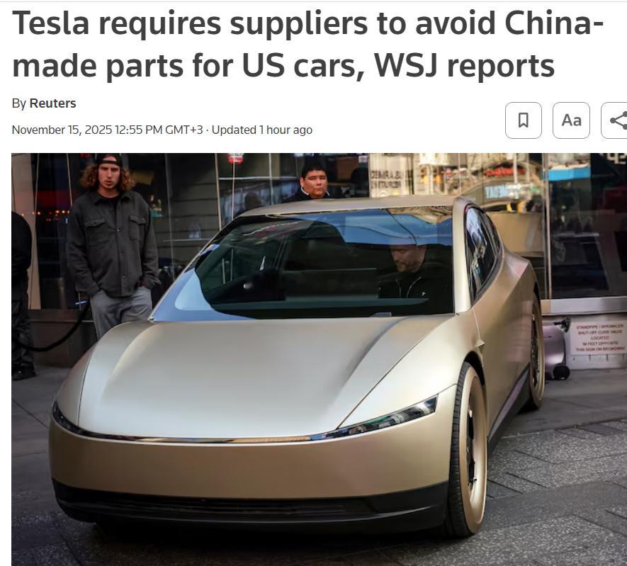11月15日据路透社报道,特斯拉已要求供应商在美国生产汽车时避免使用中国制造的零部件。特斯拉计划在未来一至两年内,将剩余零部件也替换为非中国制造。受关税威胁的影响,特斯拉两年来一直在增加其美国工厂在北美的采购量。本月早些时候,中国乘用车协会的数据显示,特斯拉10月份在中国生产的电动汽车销量同比下降9.9%至61497辆,扭转了9月份2.8%的增长。其上海工厂Model 3和Model Y的产量(包括出口)较9月份下降了32.3%。