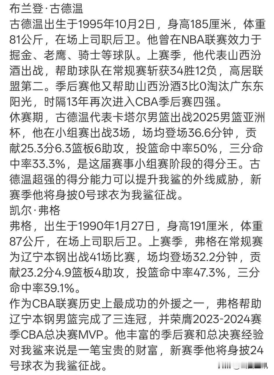上海男篮官宣:前山西汾酒男篮外援古德温正式加盟上海大鲨鱼俱乐部!场均25分的得分手古德温,或许是山西汾酒男篮新赛季放弃优先续约权最大的一块心病!本来打算留用凯尔,结果凯尔反脸去了日本联赛,导致上海男篮将最有威胁的古德温收入囊中,直接成为新赛季的对手。虽然上海男篮与山西汾酒男篮不在一个小组,但是由于上海男篮拥有了洛夫顿、弗格、怀特塞德,上海久事男篮四大天王恐成为夺冠有力的冲击者。
